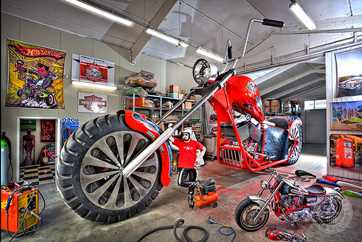 The tallest rideable motorcycle measures 16 feet, 8.78 inches from the ground to the top of the handlebars. It was constructed by Fabio Reggiani, and the motorcycle was ridden over a 100-meter course at Montecchio Emilia, Italy, on March 24, 2012.