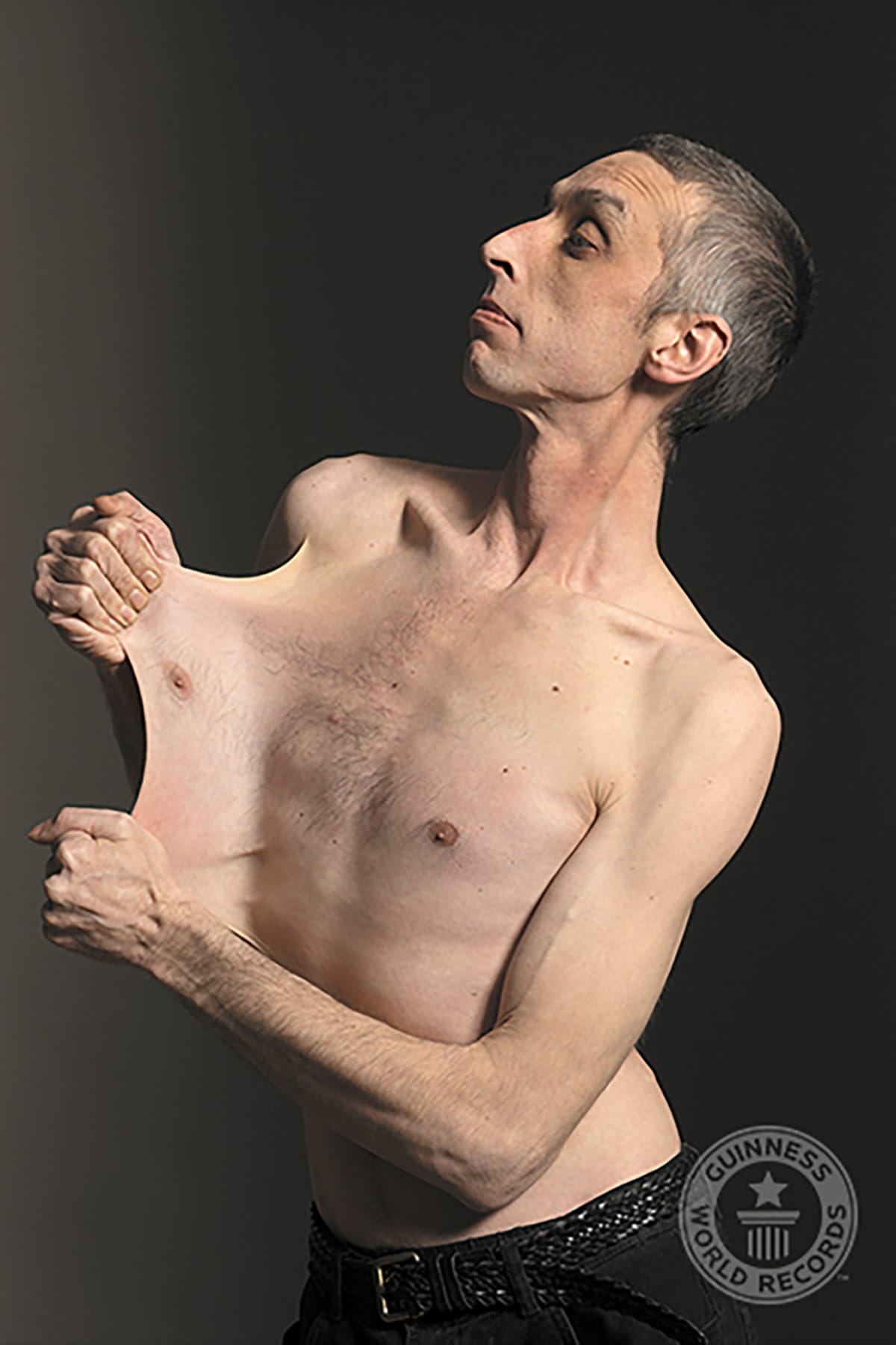 Garry Turner from the United Kingdom was able to stretch the skin of his stomach to a distended length of 15.8 cm (6.25 in) due to a rare medical condition called Ehlers-Danlos Syndrome, a disorder of the connective tissues affecting the skin, ligaments, and internal organs. People who have Ehlers-Danlos syndrome usually have overly flexible joints and stretchy, fragile skin.