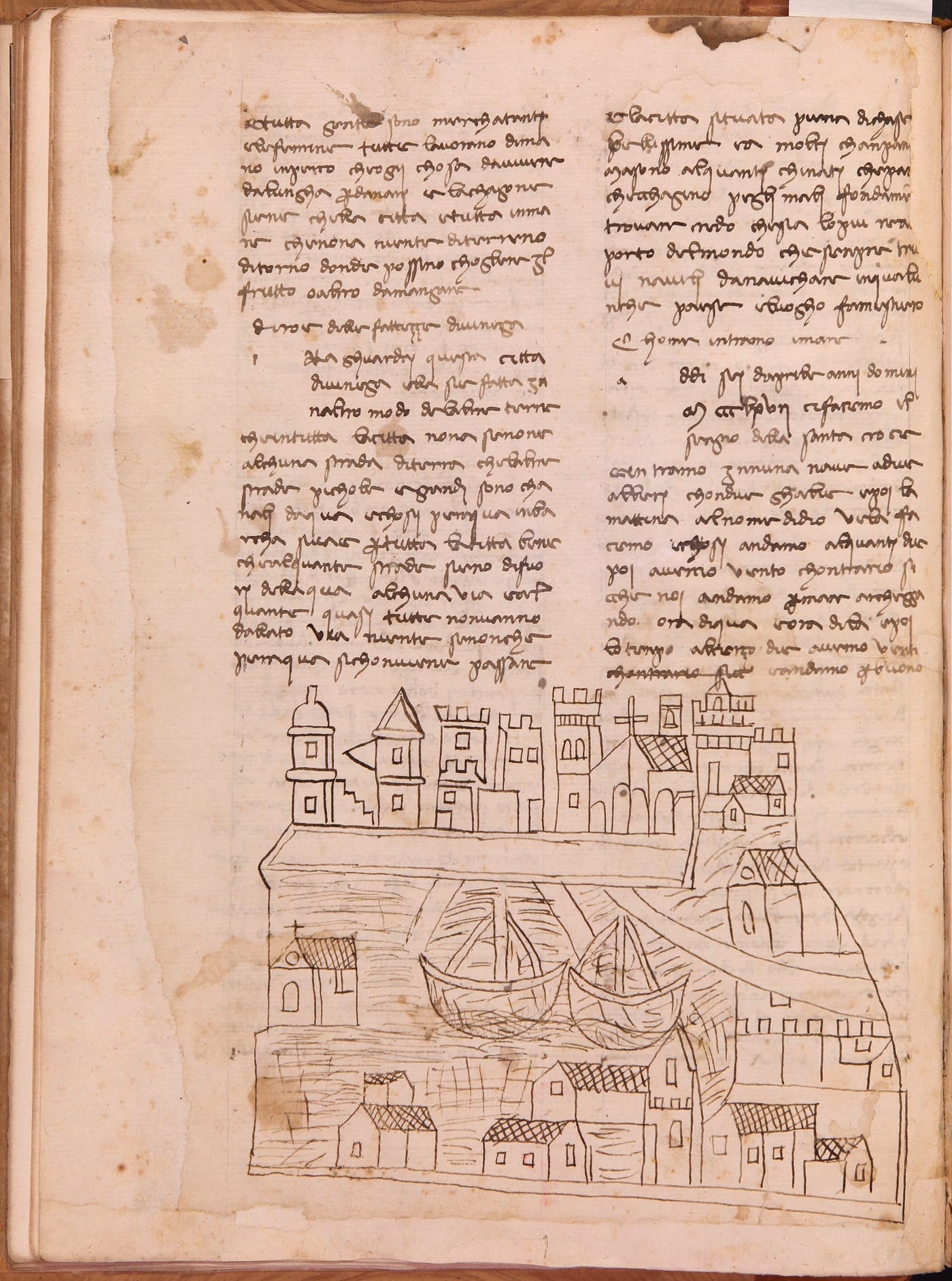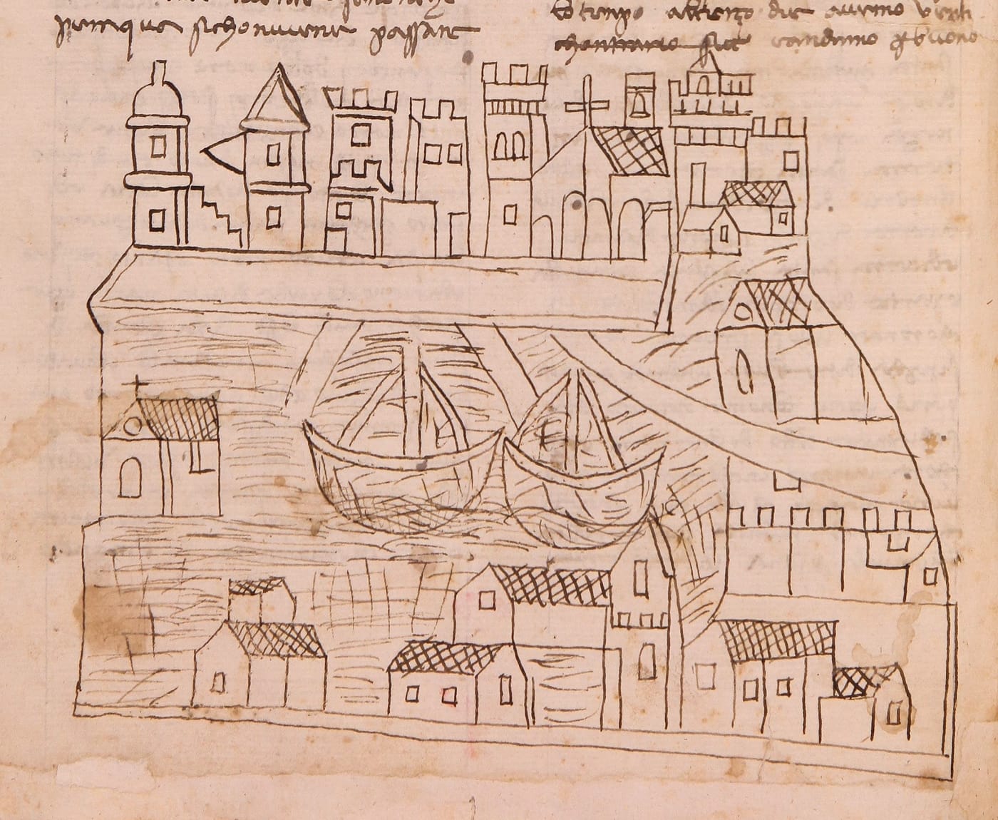 This particular image, uncovered by Dr. Toffolo in May of 2019 during her research at the Biblioteca, is part of a travel manuscript by Italian pilgrim Niccolò da Poggibonsi, who traveled to Jerusalem from Italy in 1346-1350. The pen drawing accompanies a description of Venice, which he passed through in the course of his pilgrimage.