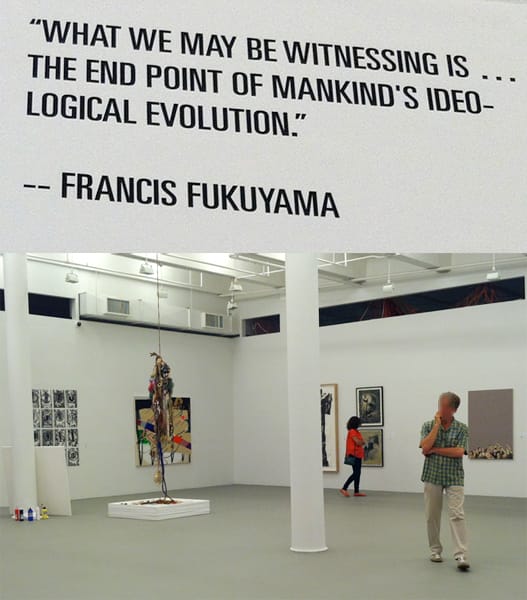 The Originals felt like an offering from a similar menu. My intention isn’t to humiliate the artists on view. The show, in many ways, looks and feels like any other large group exhibition that brings together a little bit of this and a little bit of that, but adds up to nothing in particular. The exhibition is harmless, even silly. What isn’t harmless, and what I found distasteful, is the grandiosity of Mana Contemporary and its attempt to pass a buffet of artists as a groundbreaking exhibition. The wall text, which greets visitors as the enter the gallery, states: “What we may be witnessing is … The end point of mankind’s ideological evolution.” This declaration is an excerpt from Francis Fukuyama’s 1992 book The End of History and the Last Man.