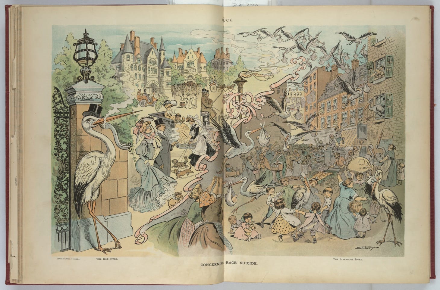 In the early 20th century, the fertility of White people became a significant issue within the United States. Adam Domby, an assistant professor of history at the College of Charleston and author of the forthcoming book The False Cause: Fraud, Fabrication, and White Supremacy in Confederate Memory, noted in comments to Hyperallergic that politicians such as Theodore Roosevelt at this time became preoccupied with an issue called “race suicide.” The term had been coined by sociologist Edward A. Ross at the turn of the century and described what happened when the death rate of a race exceeded the birth rate. In 1910, Roosevelt gave a speech to the French Academy, noting: “The chief of blessings for any nation is that it shall leave its seed to inherit the land.” The French were greatly enamored with Roosevelt’s harangue to have more children in order to strengthen the nation. Linking White fertility to patriotism was a popular talking point in the early 20th century even well before the rise of Nazi Germany.