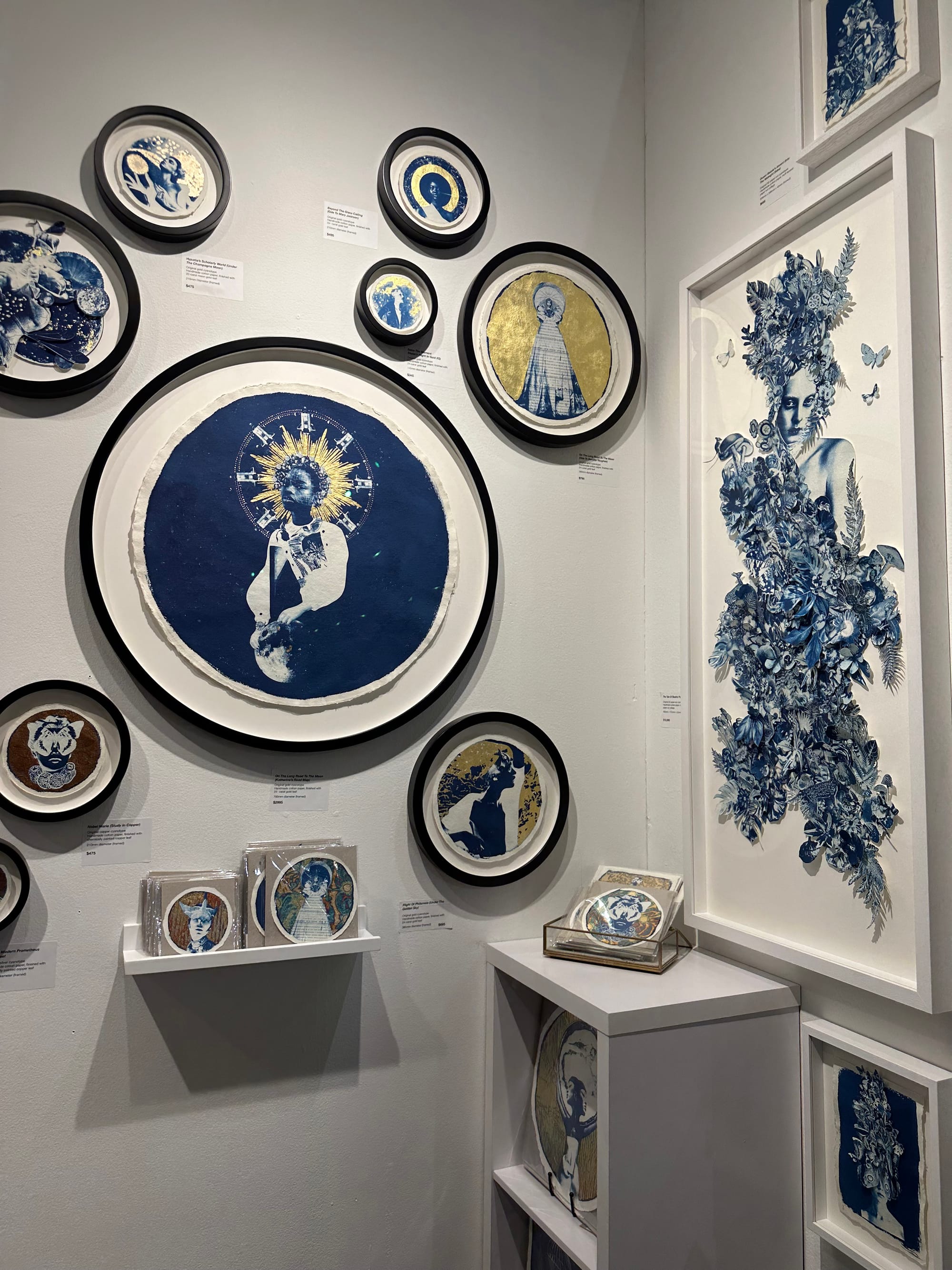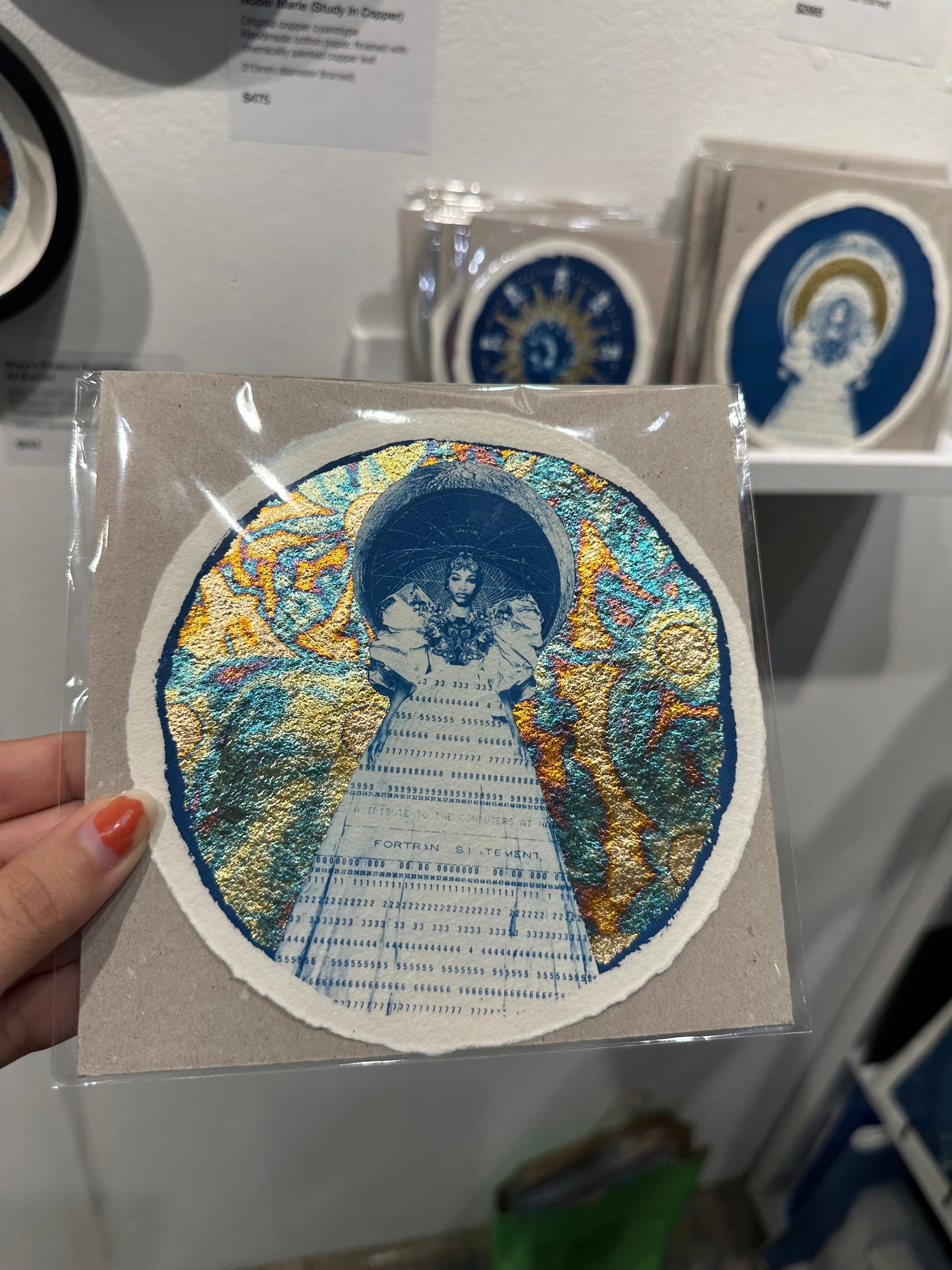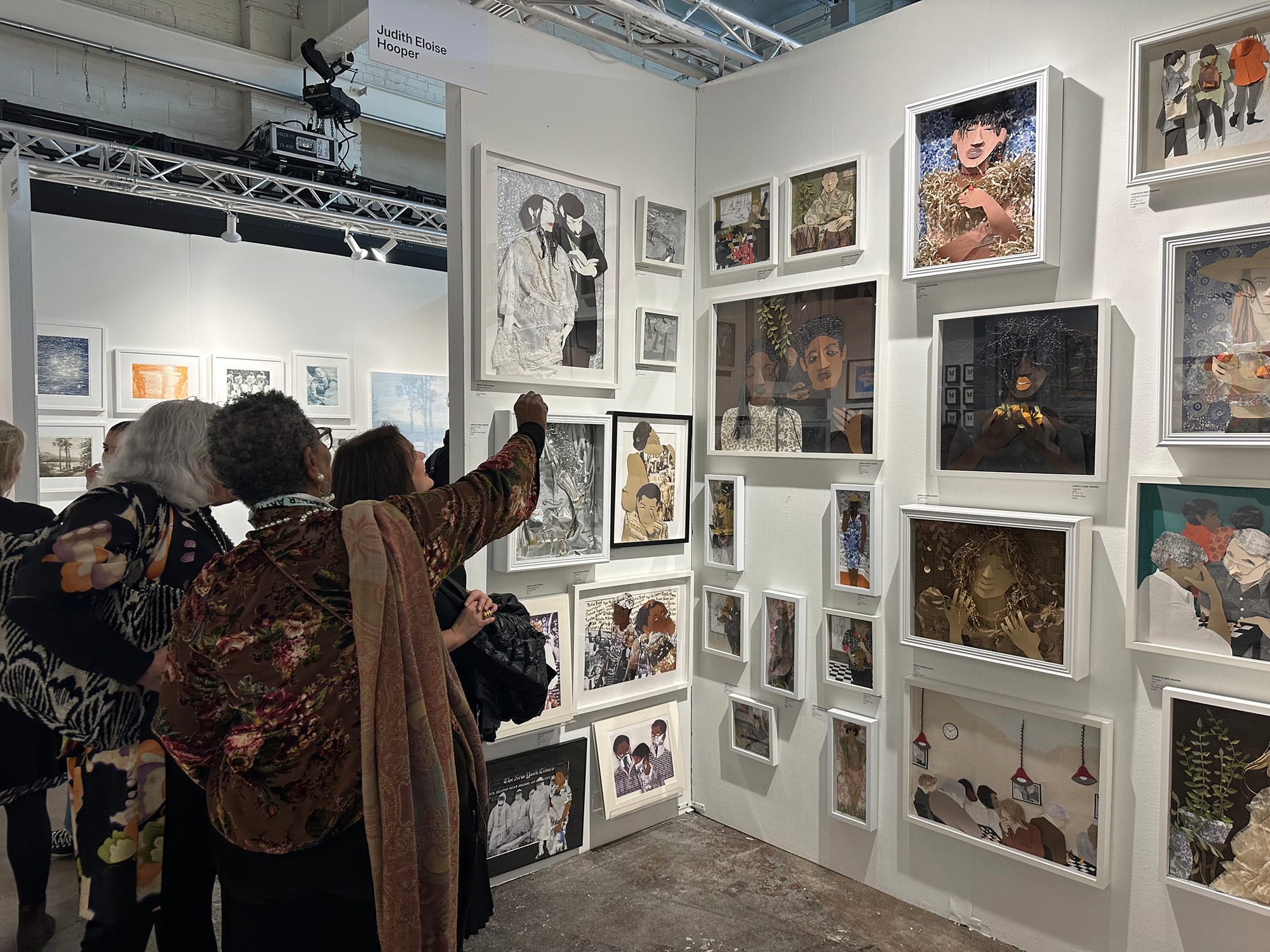 The majority of larger works cost thousands of dollars, but several artists were offering prints for as little as $50. London-based Chloe McCarrick’s booth of collages and cyanotypes featured a corner dedicated to batches of small works, including a $175 shimmering portrait on recycled paper in honor of the late NASA programmer Dorothy Vaughan. I even came across a framing station meant for people taking works home with them, a fitting counterpart to the fair’s online resource demystifying the process of buying your first artwork; an artist near the station was patiently walking a visitor through the steps.