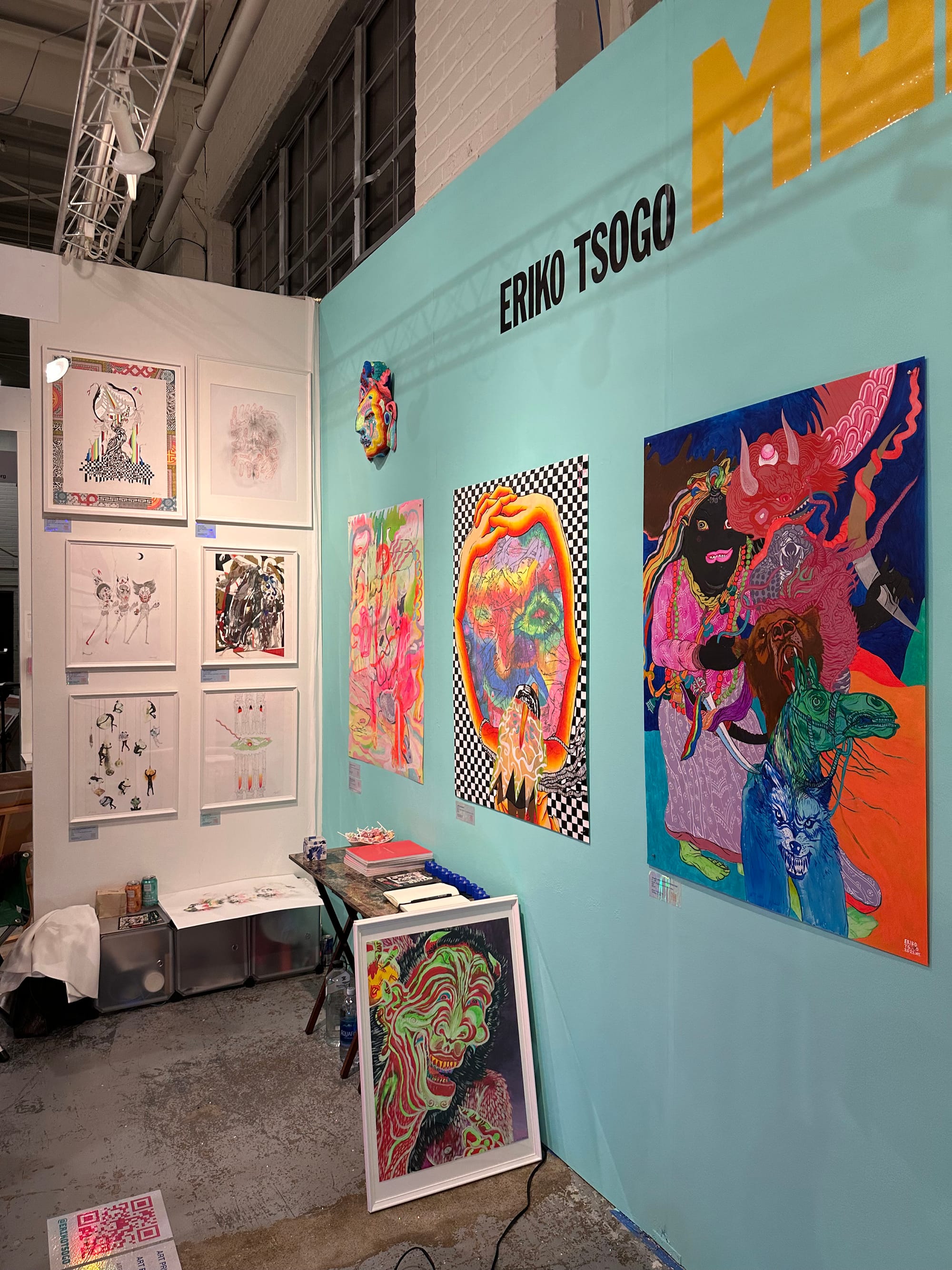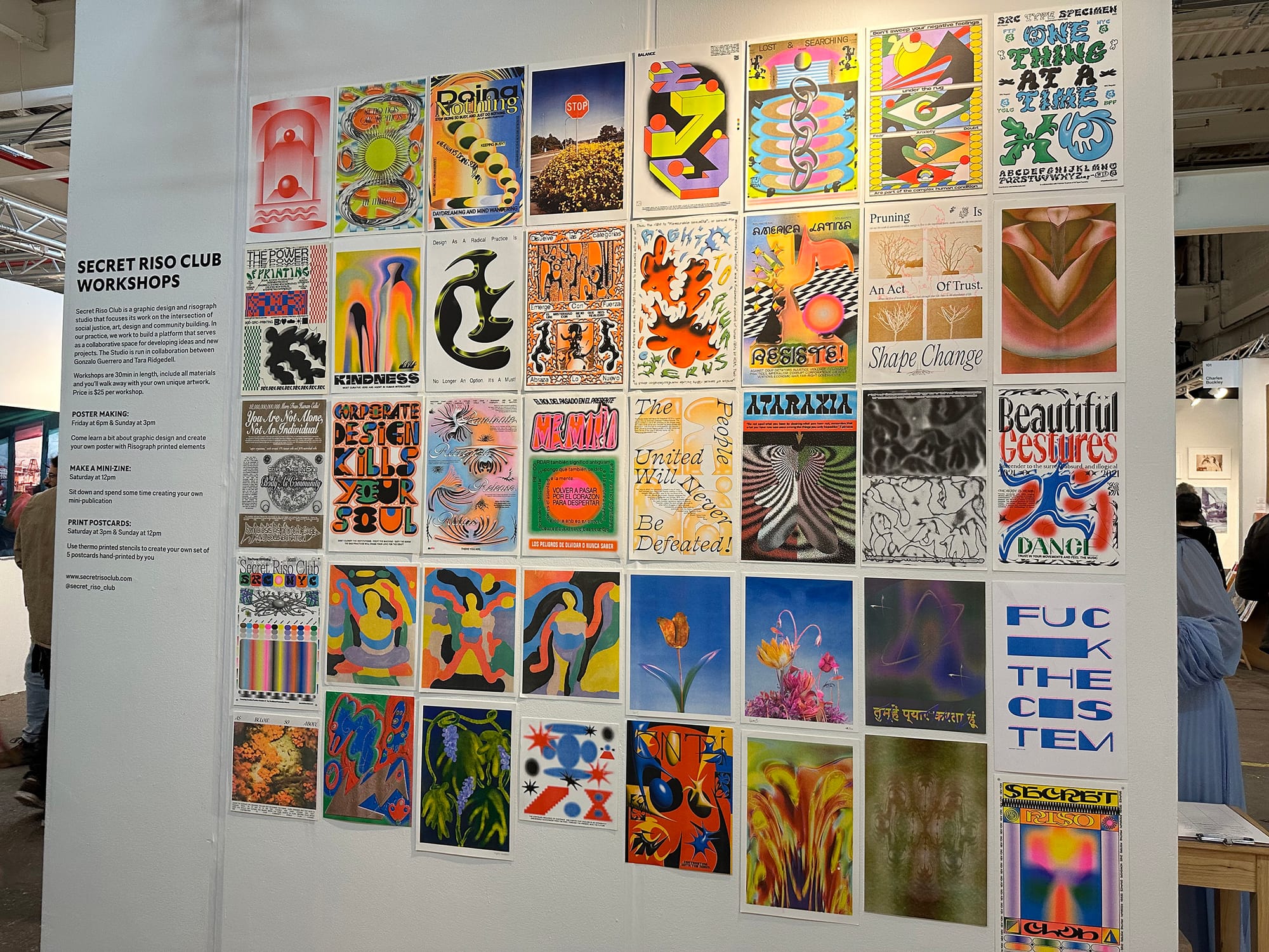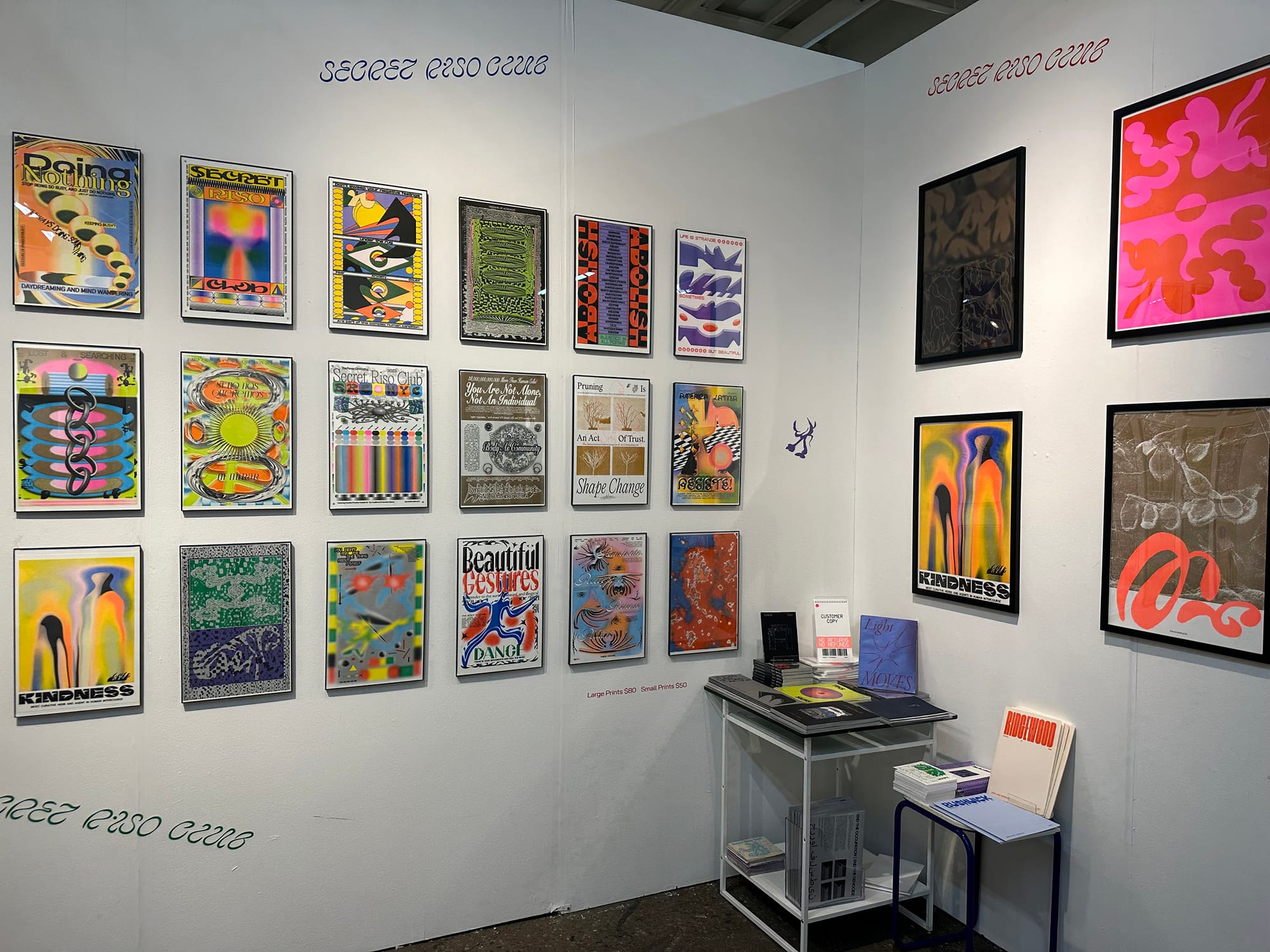 Beloved risograph studio Secret Riso Club set up an expansive display of bright posters that caught my eye. Tara Ridgedell, who runs the organization with collaborator Gonzalo Guerrero, told me they regularly frequent book fairs. But this is their first time in an art fair booth — and with enough space for every risograph design they’ve created. One work she and Guerrero collaborated on reads “Ruminate, Recognize, Release, Return.” “That’s the process that I come to of going through your emotion, feeling it, and letting it go,” she said. “And then coming back to yourself.”