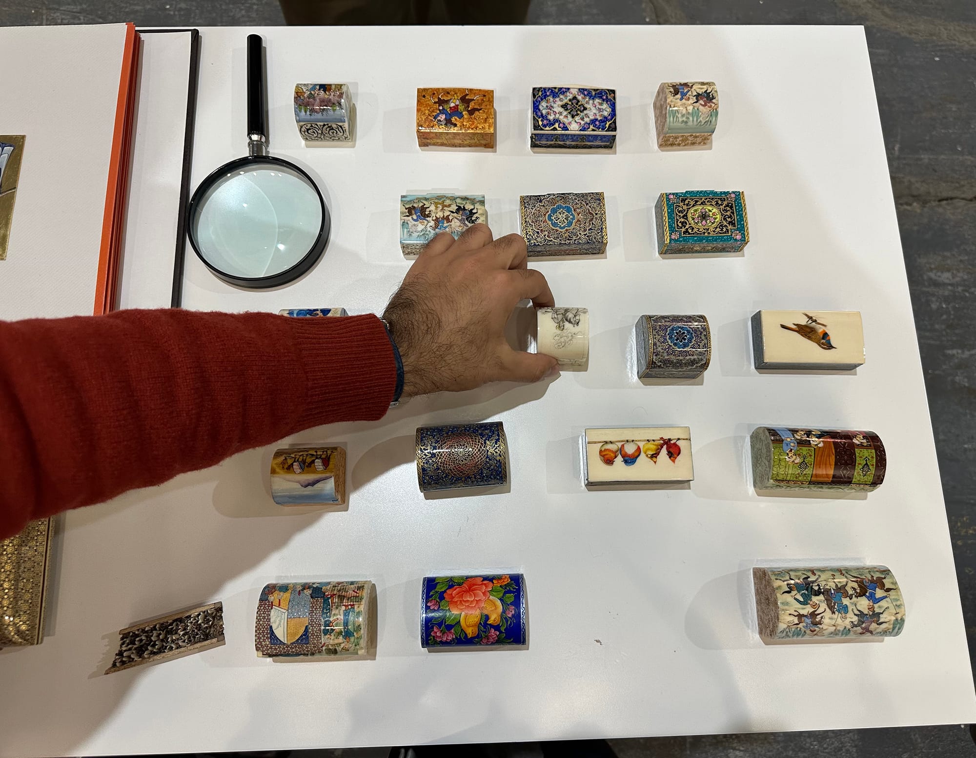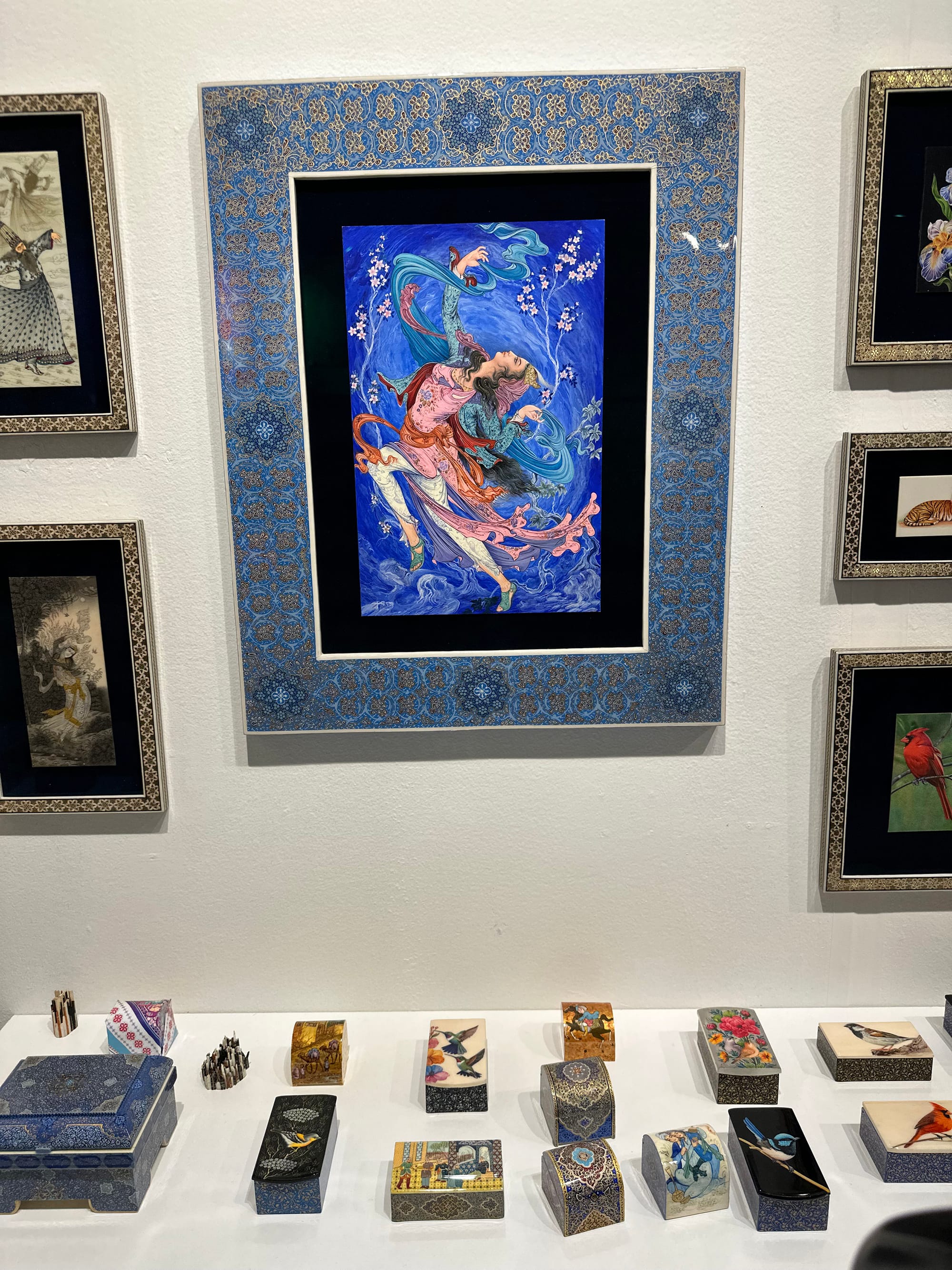 Another true feast for the eyes was artist Mostafa Fotovat’s deliciously detailed paintings and camel bone boxes in the style of Persian miniatures. He uses a cat-hair paintbrush, which is fine enough to allow for the precision that the designs require, and collaborates with his father and sister. A table lined with delicate boxes also held a magnifying glass for visitors, which he noted he sometimes uses while painting.