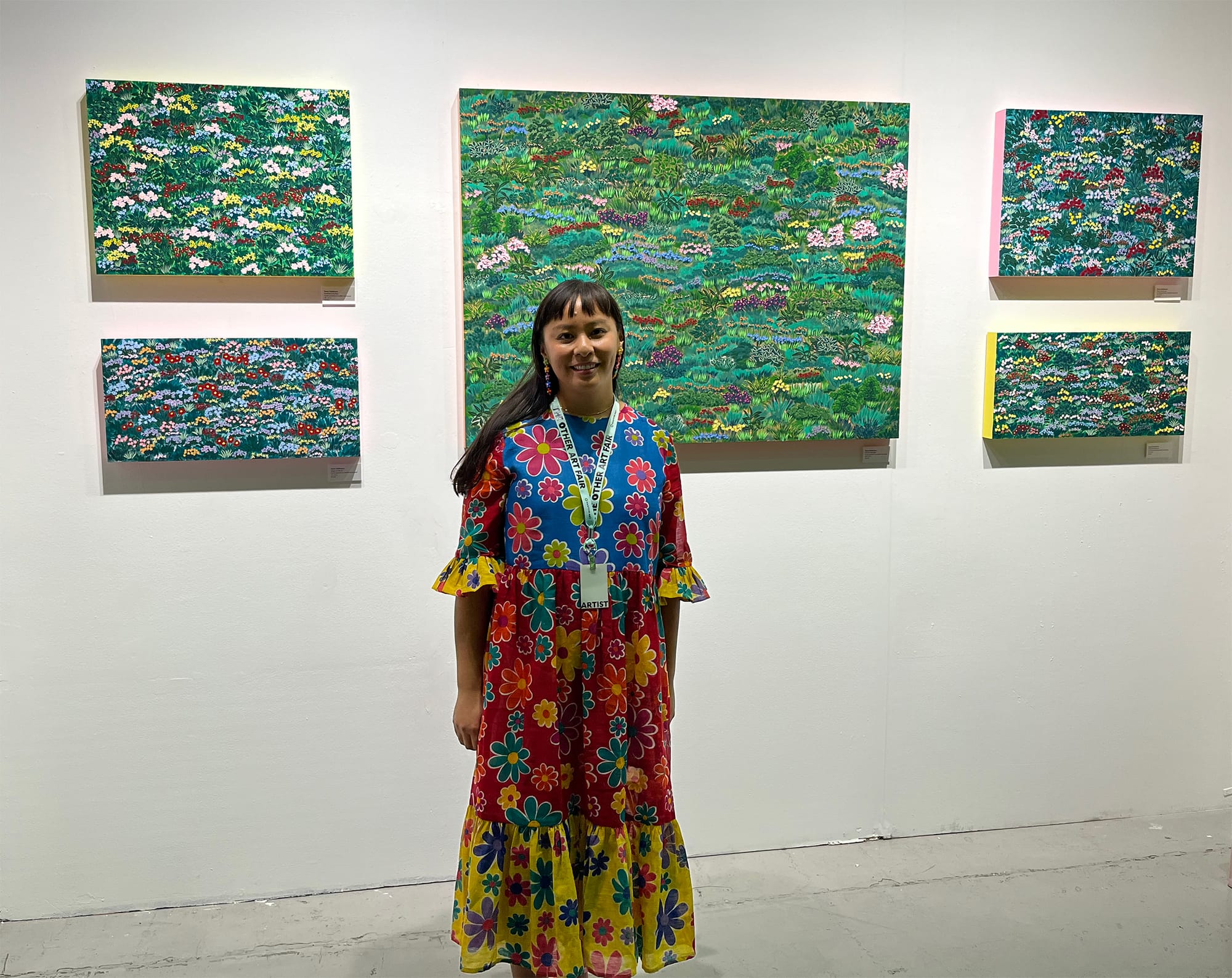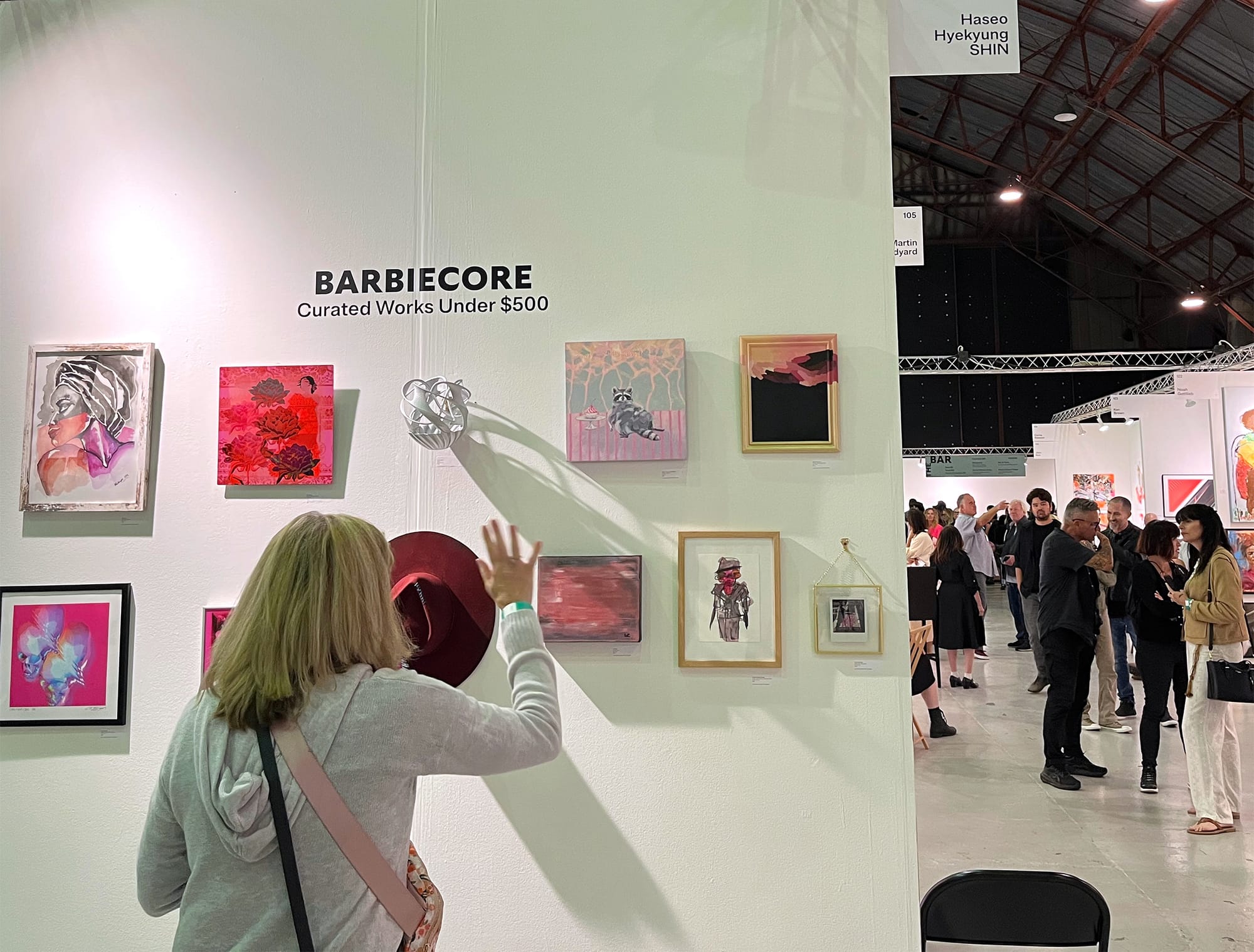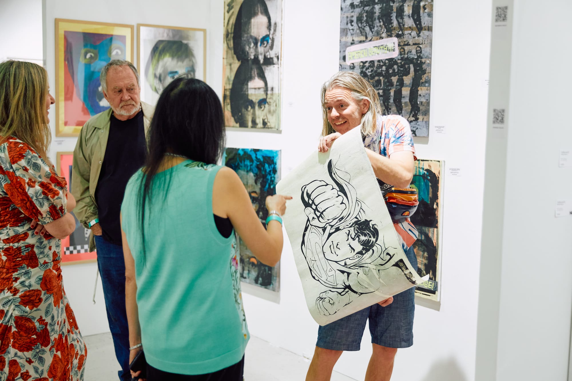 The fair welcomed both local artists such as Ochoa and those from far-flung locales. At her standout booth of paintings, Istanbul-based Erna Ucar had sold all but one of her seven canvases by 7:45pm. For five years, Ucar has shown with Saatchi Art, which supports her appearance at the fair. “I love the atmosphere. It is not only about art. I can meet other artists,” Ucar said, with the help of a translator. Her paintings depict crowds amid distinctive blocks of colors and textures: The artist makes composite images from her photographs of herself and other people, then builds up her surfaces with acrylic, graphite, and sand on unprimed cotton canvas.