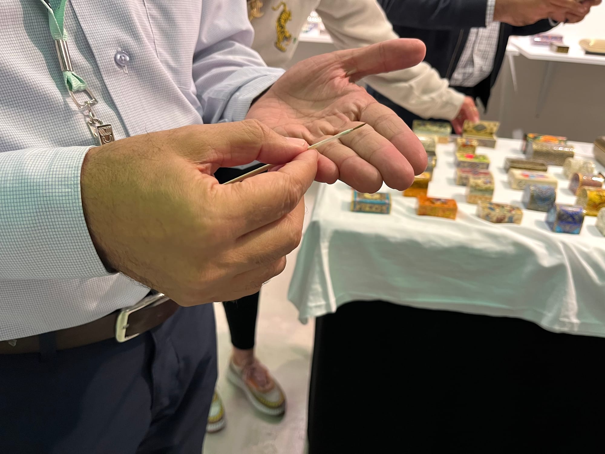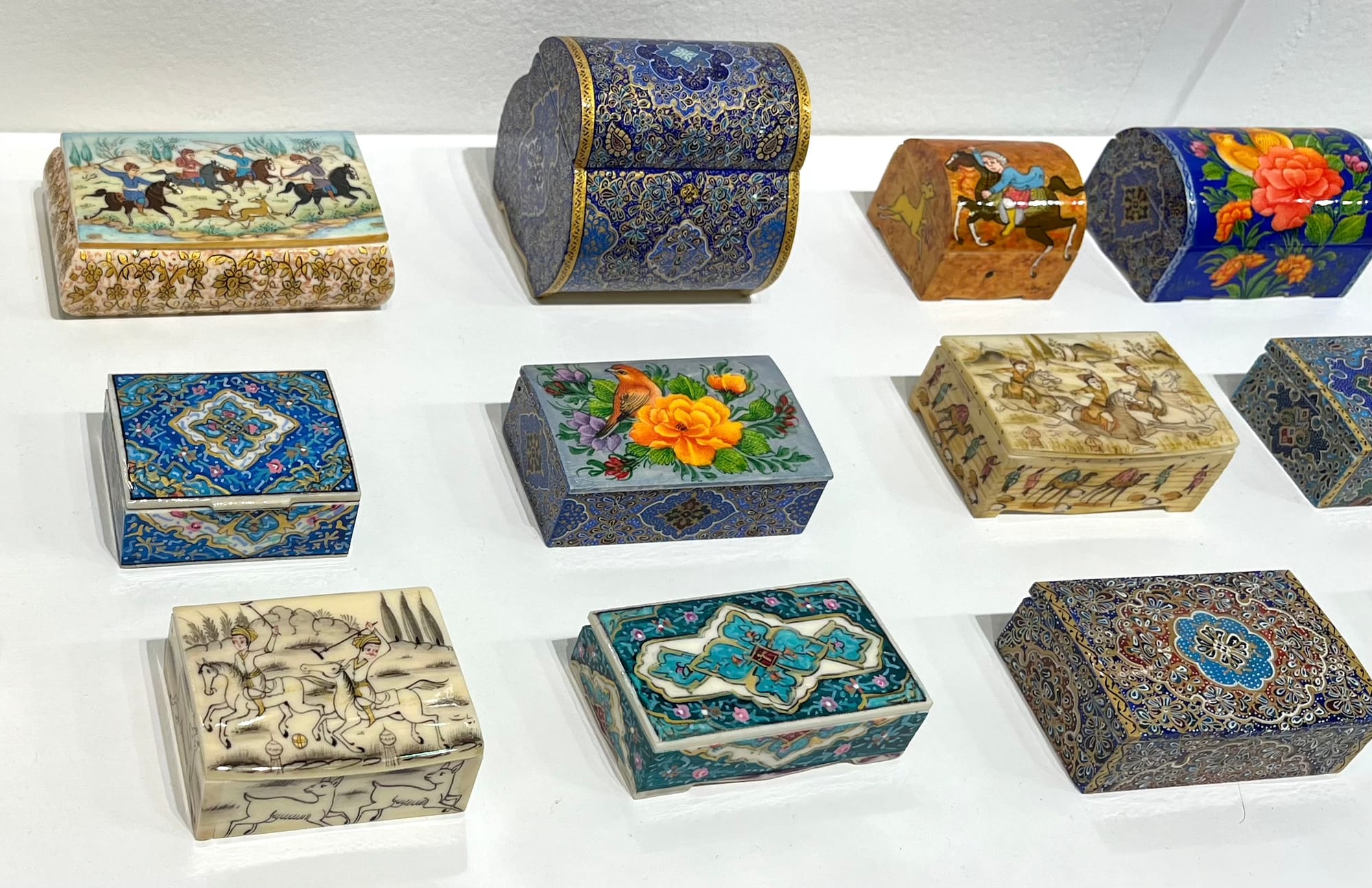 A few rows over, Mostafa Fotovat and his family showcased a very different kind of painting. In town from Fort Lauderdale, the artist paints intricate designs with a homemade cat hair paintbrush on watch faces and camel bone boxes. He uses natural materials — lapis lazuli, turquoise — and a gum arabic medium. A microscope was on view, indicating the artist’s precision and rigor as he creates his finely detailed scenes. If Fotovat’s intricate miniatures offer a striking divergence from the supersaturated painting of a skatepark at the next booth over, Fotovat insists his work is contemporary. “We are working now,” he said. He has shown in the Brooklyn and Dallas editions of the fair, and this was his first time showing in Los Angeles. So far, he said, he’d visited Hollywood, downtown, Century City, and Santa Monica. He added that it is a beautiful city.