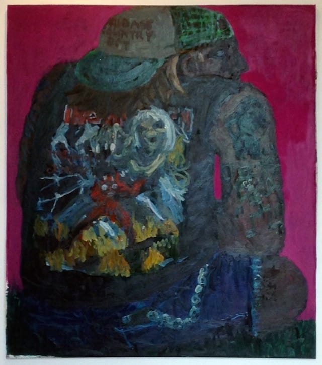 Todd Bienvenu, the wild man of Bushwickian narrative painting, who told Jennifer Samet of Hyperallergic Weekend that his pictures “are about sex and death and enjoying your life,” delivers an unexpectedly monumental work. “Iron Maiden” (2014) portrays a seated baseball-capped and tattooed slacker, his face in profile and his back to the viewer, wearing a muscle shirt emblazoned with the classic heavy metal band’s logo and decorated with properly Satanic imagery.