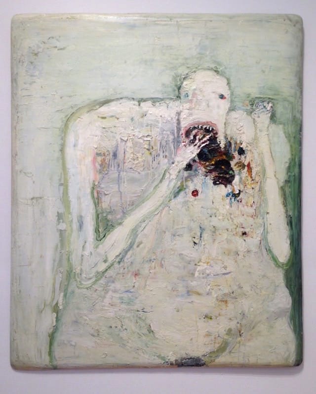 The exhibition’s freewheeling take on portraiture comes to full flower in Brenda Goodman’s above-mentioned “Self-Portrait 13,” which portrays a hulking, spindly-armed monster stuffing God-knows-what into its mouth. Clearly deriving her image from Francisco Goya y Lucientes’s “Saturn Devouring His Son” (1820–1823), the most seriously unhinged of the artist’s Black Paintings, Goodman inverts the original color scheme from Stygian earth tones to pale whites and greens, and trowels the paint on so heavily that the hand cramming that undetermined substance into the monster’s mouth actually lifts off the surface, creating a three-dimensional form.