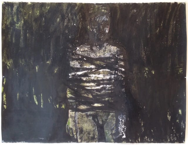 Also of note is Elisa Jensen’s “Loke” (2006), a large black-and-white drawing in Sumi ink, egg tempera, gouache and pastel pencil. It depicts a nude man bound in rope against a backdrop of vertical slashes that could indicate a dense stand of trees. The blackness surrounding the figure is so intense that it creates its own densely pigmented atmosphere, pushing the figure forward. The nude’s deeply shadowed face and unexplained bondage make it less of a portrait and more of an hallucination, and a stark, simmering one at that.