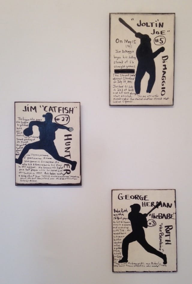 Take James Prez’s deeply affecting trio of silhouetted baseball players: Joe DiMaggio, Catfish Hunter and Babe Ruth (all 2009). Each of these small works (15 by 12 inches) in house paint and Sharpie on Luan (a variety of plywood) present the player in action — throwing a pitch or swinging a bat — along with his number and a handwritten capsule bio that reads like stream-of-consciousness fanboy idolatry. The snippet on Catfish Hunter concludes: