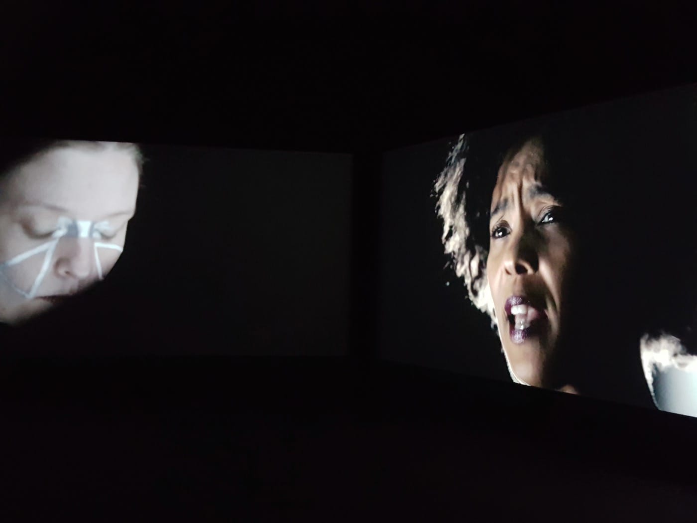 During the video, that lasts 50 minutes, two performers (a black man, Dante Micheaux, and a black woman, Elaine Mitchener) recite the entire statement. It is a riveting recitation by both actors, whose deliveries are very different. Micheaux, who performs at the beginning of the video, is calm and matter of fact in his approach, while Mitchener at certain points wails, as if begging the audience to hear and understand the import of what she says. After the actors’ declamation the pianists play — four pianists at two pianos bring “Evil Nigger,” “Gay Guerrilla,” and “Crazy Nigger,” to life. The appearance of the four pianists provide an odd visual contrast: they are all white and their faces are marked with abstract shapes contrived with silver makeup. The combination of the extraordinary visuals and the minimalist music of Eastman — an avant-garde, black, gay composer of music that sounds otherwordly — keeps me in my seat with no sense of time passing.