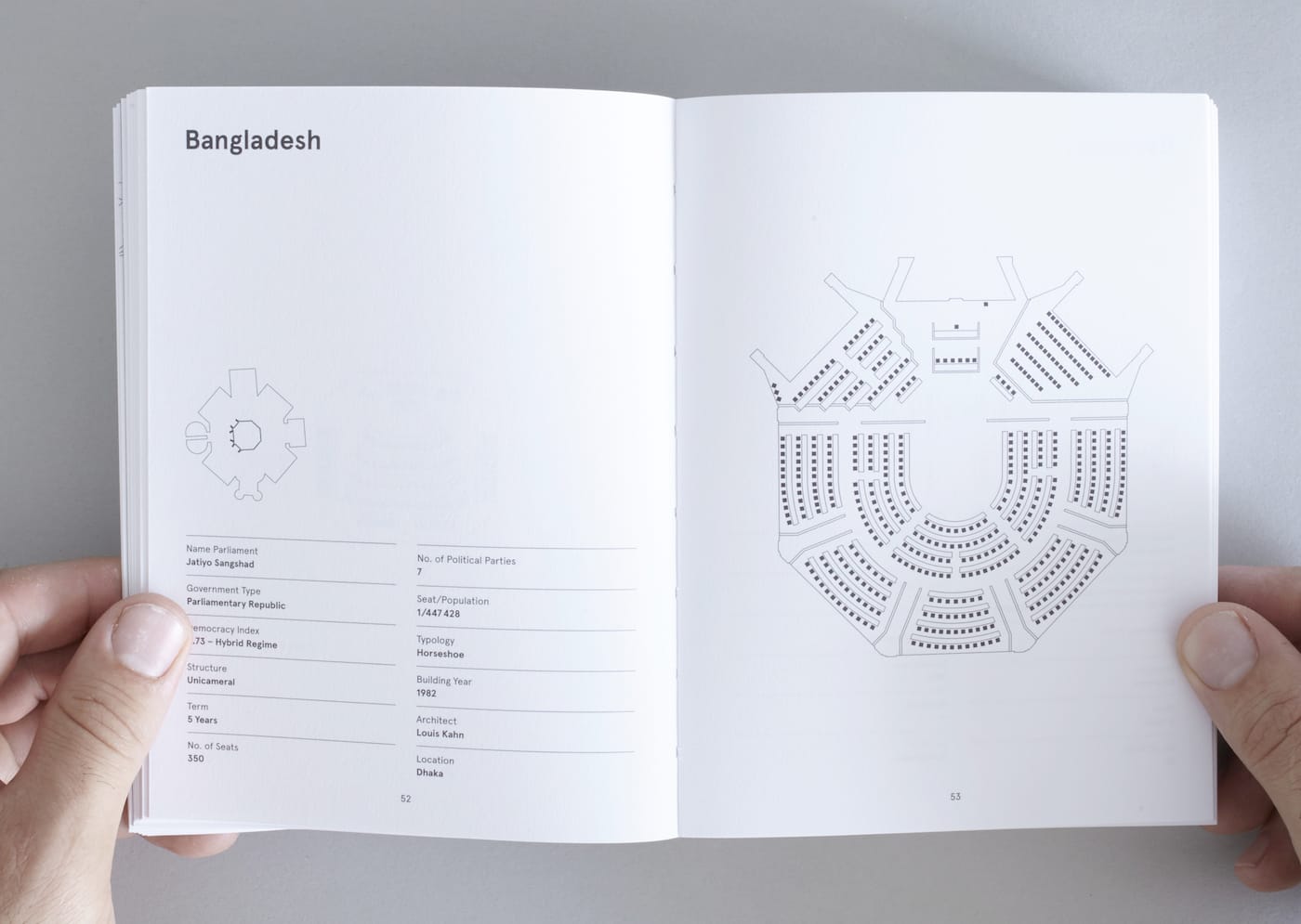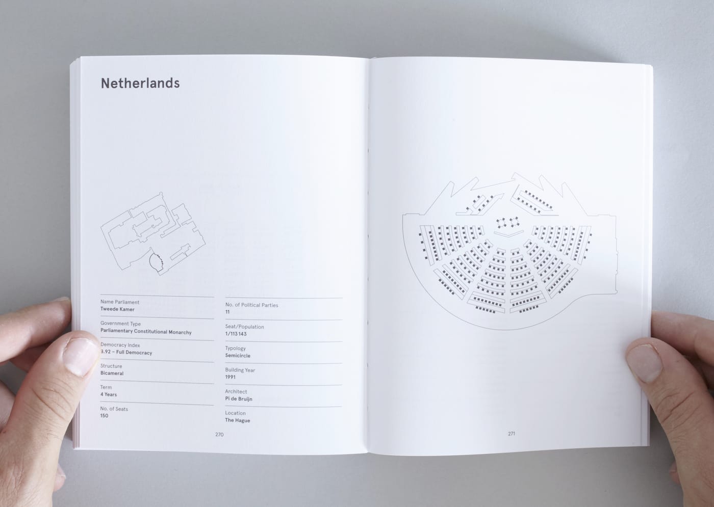 XML has published these findings in a very handy and beautifully designed manual, Parliament, available through Idea Books. It’s the first tome to provide an overview of parliaments around the world that allows you to easily compare their plans. The book is laid out like a directory: each entry features a simple diagram by XML, along with data such as the room’s number of seats, the nation’s government type, and its democracy index. In the back are indexes that organize the parliaments in a variety of informative ways, such as by building year or by seat-to-population ratio. Thumbing through the pages reveals trends, most notably that the same five architectural foundations have persisted over time, even as our political systems have transformed considerably.