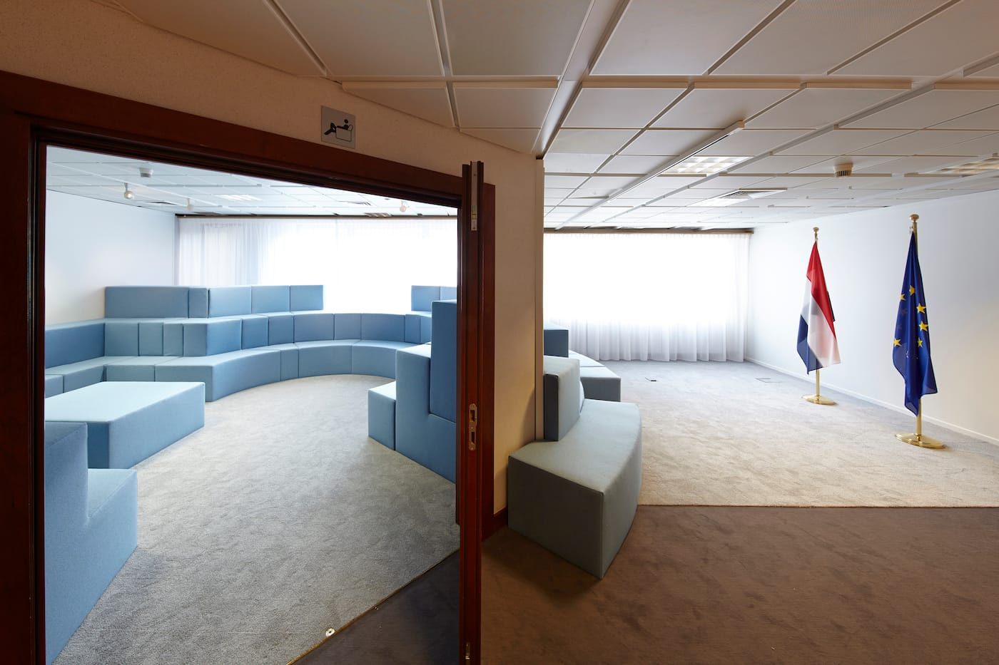 So what should a parliament for the 21st century look like? Parliament doesn’t provide a solution, although it argues that these spaces need innovative updates. But last year, XML had a chance to experiment with a new form, when the Dutch Ministry of Foreign Affairs commissioned the firm to design a meeting room in Brussels for European government leaders. The result combines opposing benches with a semicircle through a series of interlocking, powder blue blocks that allow for fluid seating.