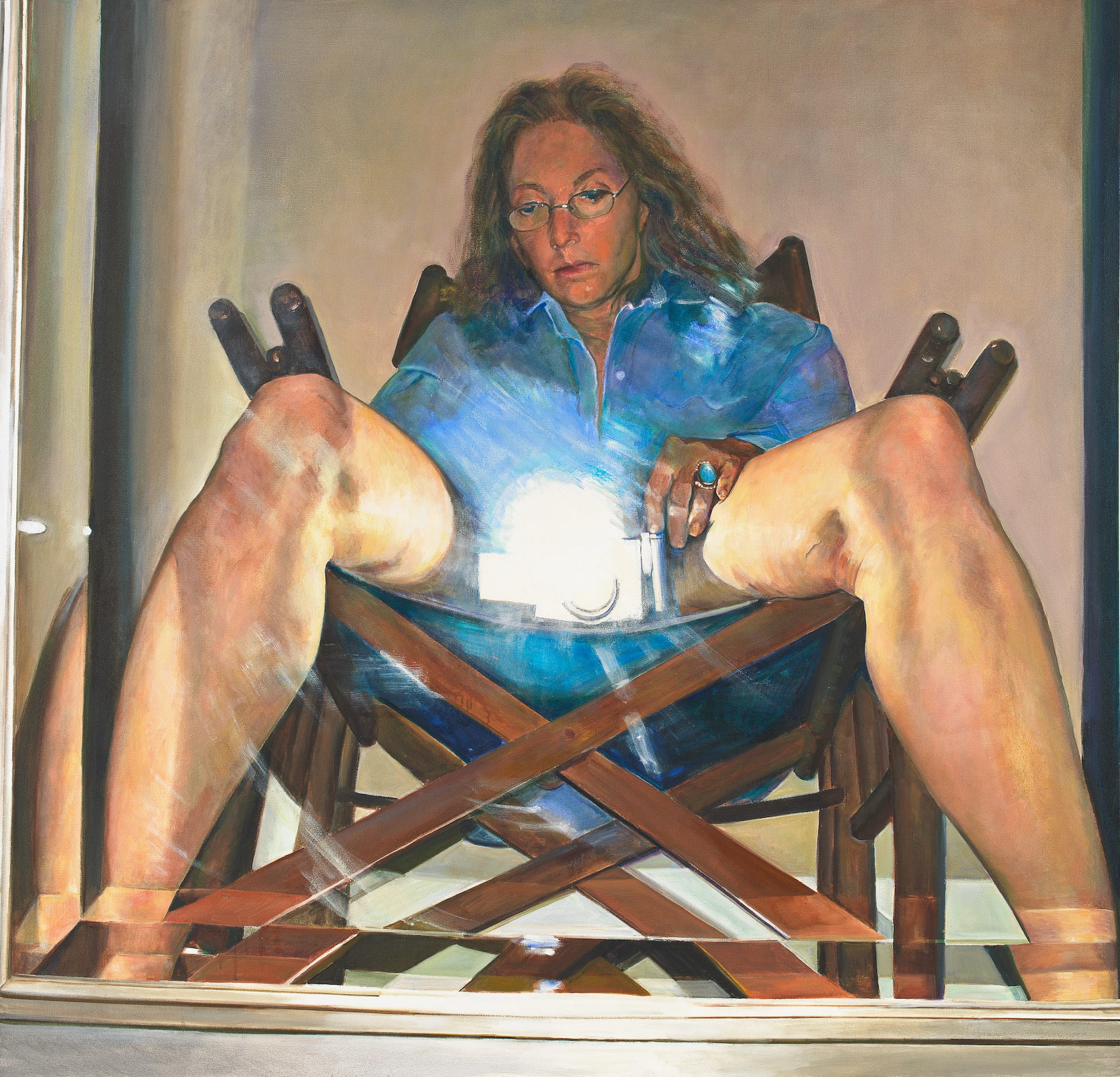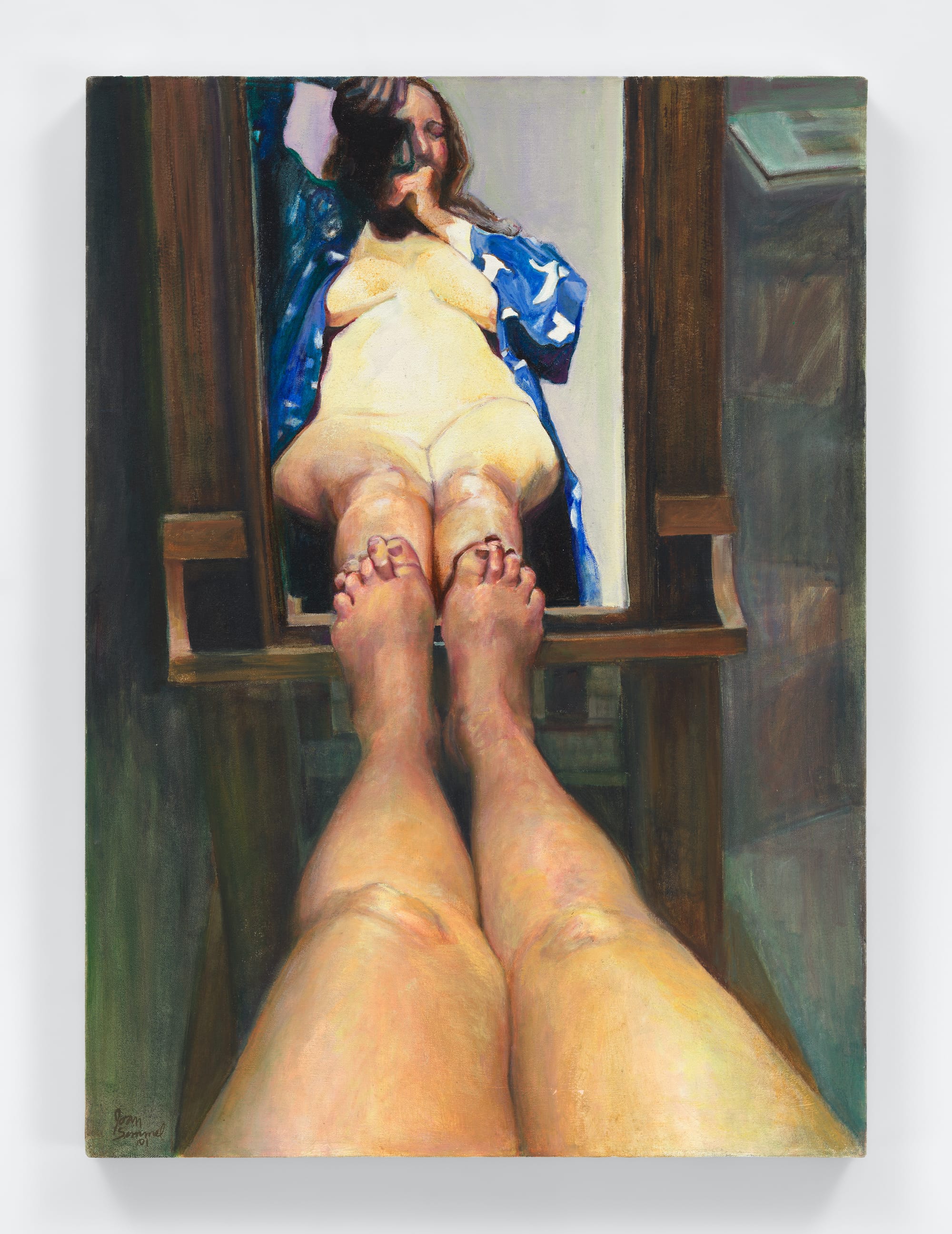 But in this exhibition, which originated at the Philadelphia Academy of Fine Arts in 2021, curated by Jodi Throckmorton, the emphasis — at least in the abbreviated version at the Johnson Museum, organized by Andrea Inselmann — is on the various points of view Semmel has taken on herself — and, briefly, on others too. Mirrors entered her imagery with the Locker Room paintings of 1988 to '91 (not shown here), which capture women tending to themselves. In subsequent, solo portraits, mirrors often reflect the camera in Semmel’s hand, wielded as both weapon and defense. We see Semmel playing footsies with herself in the spry little “Toes to Toes” (2001), in which her outstretched legs touch the mirror image she is painting. In “Centered” (2002), her mirrored face is completely obscured by the camera she holds in one hand, balancing it on a forearm; reaching toward her from behind is a rather menacing mannequin, one of several that appear in work of this period, in another play of artifice against reality. The 2005 “Double X” — the title seems in part a reference to audience-advice ratings for movies — shows the artist clothed and sitting in a chair whose cross-pieces form the titular X’s; she looks down dispassionately, through glasses, at a camera placed between her spread legs. Its flash blooms white. The frame of the mirror she faces is also partly captured in the image. It is a kind of lexicon of her visual vocabulary: camera and mirror, the explosive luminosity of sex, and the slightly melancholy distance she’s assumed from all that. Writes critic Richard Meyer in Artforum, this painting shows her as both “object and agent of vision.”