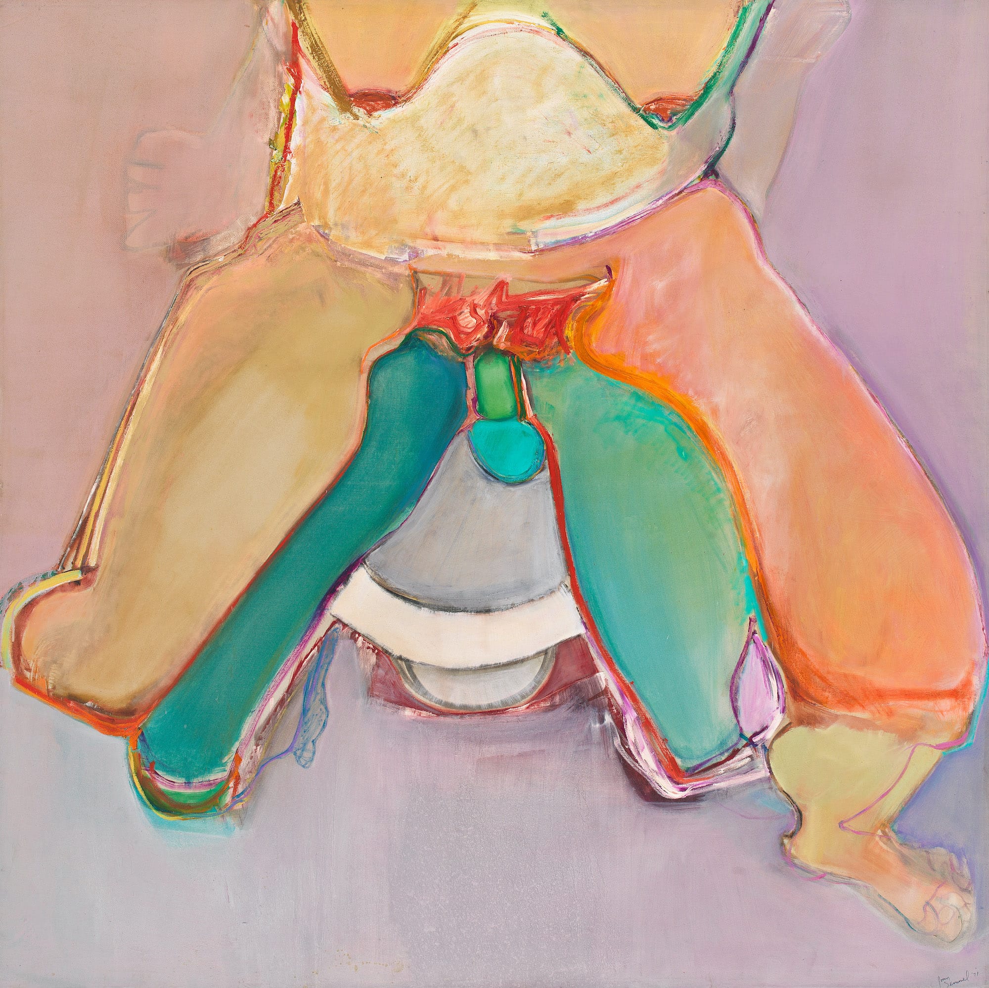 Despite their provocations, a great deal of tenderness, and thought, is in these images. Early in her career, Semmel (who was born in the Bronx in 1932) was temporarily sidelined by illness and parenthood, and spent eight years in Spain, at first with her husband and then on her own. While there, she enjoyed a successful career as an Abstract Expressionist painter; a single, vigorous painting from that period is on view. But after returning to New York in 1970, she jumped into the deep end of second-wave feminism. As a member of a loose collective called Fight Censorship, founded by Anita Steckel and including such disparate artists as Judith Bernstein, Louise Bourgeois, and Hannah Wilke, Semmel launched a series of Sex and Erotic paintings. For the latter, she rather boldly engaged a man who, she told Jennifer Samet in a 2018 interview, was “a bit of an exhibitionist” and “liked to have sex with people watching”; other artworks drew from print images of softcore porn. Using electric Kool-aid acid shades of red, purple, and green, the Sex paintings included such images as “Hot Seat” (1971), in which a woman straddles a man sitting on a toilet. Mostly, we see his turquoise thighs beneath her pinkish ones, her torso, and active intercourse: The painting’s focus is the point of penetration; her pubis a fiery red.