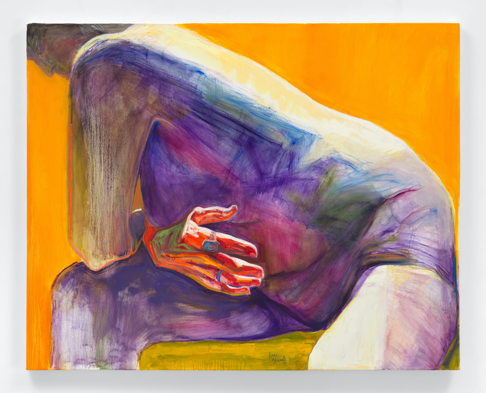 The exhibition’s epic centerpiece (and title work) is “Skin in the Game” (2019), a four-panel frieze in which the artist is seen standing, seated, lying down, and covering her eyes as if being expelled from the Garden. But to my mind the standouts are “My Saskia” (2018) and “Red Hand” (2020). In these works, the paint has gotten thinner, as has the skin it depicts. The pull of gravity on heavy limbs and pendulous breasts is defied by blasting, vaporizing light. Paint cascades like rain on stone down a columnar upper arm and then electrifies a vivid hand; a fall of hair and the slope of a monumental back are dazzled by what looks like direct sunlight. Semmel’s early paintings burrowed inside; these are radiantly, gloriously open.