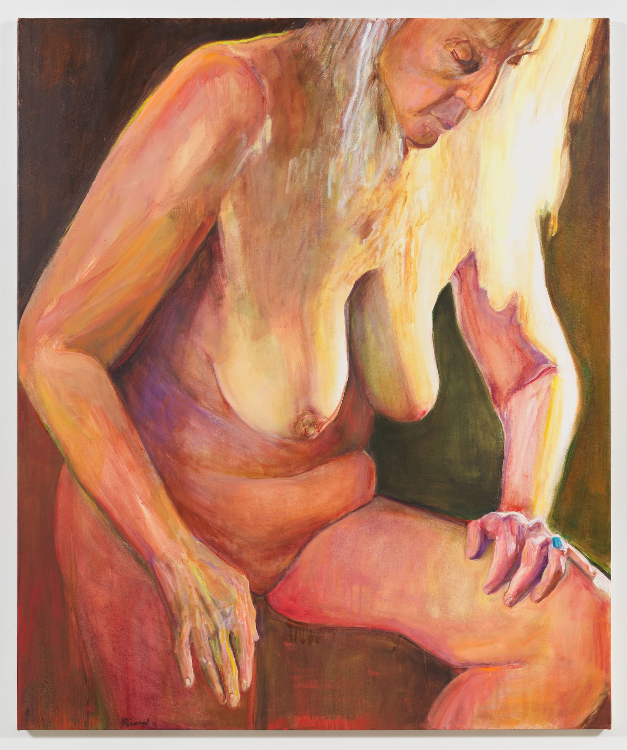 While the avalanche of mirrored aging selves we all regularly face can be a touch harrowing, Semmel’s most recent paintings manage, rather magically, to meld despair with exaltation. Over the years, she has had many companions in nude self-portraiture, ranging from Martha Edelheit and Maria Lassnig to Cecily Brown and Jenny Saville — that is, from shared declarations of independence to festivals of flesh. Now nearly 90, Semmel is working pretty much on her own, and this survey’s most ravishing works are its most recent. Alice Neel’s unsparing self-portrait at 80 is a lone point of comparison; a signal difference is that Semmel doesn’t show herself, as Neel does, with a paintbrush in hand. Other props Semmel used earlier — mirror, camera — are absent too. But nothing else is held back. The scale is huge, geological, the color rapturous.