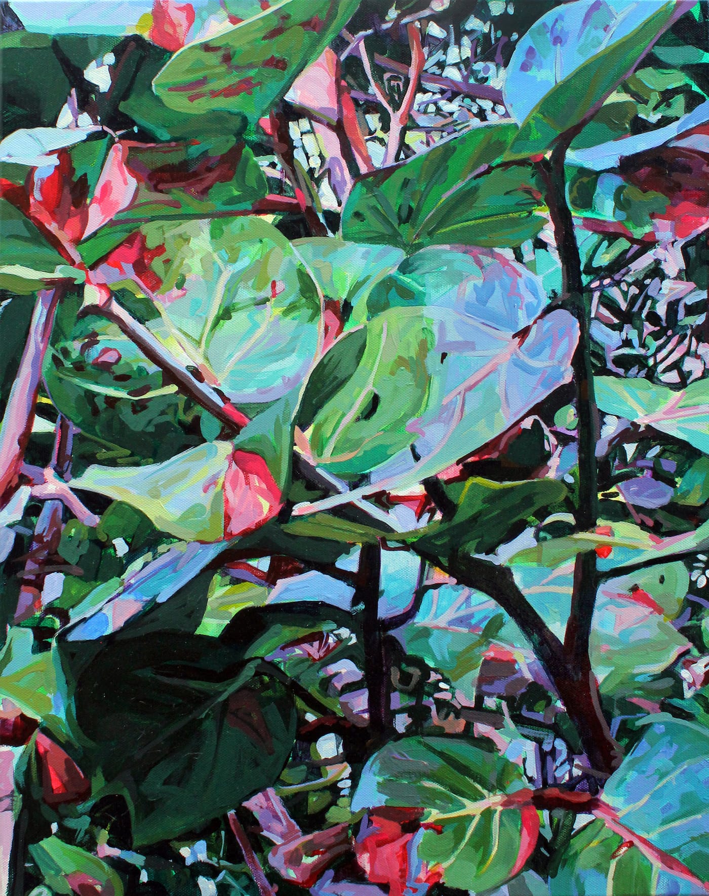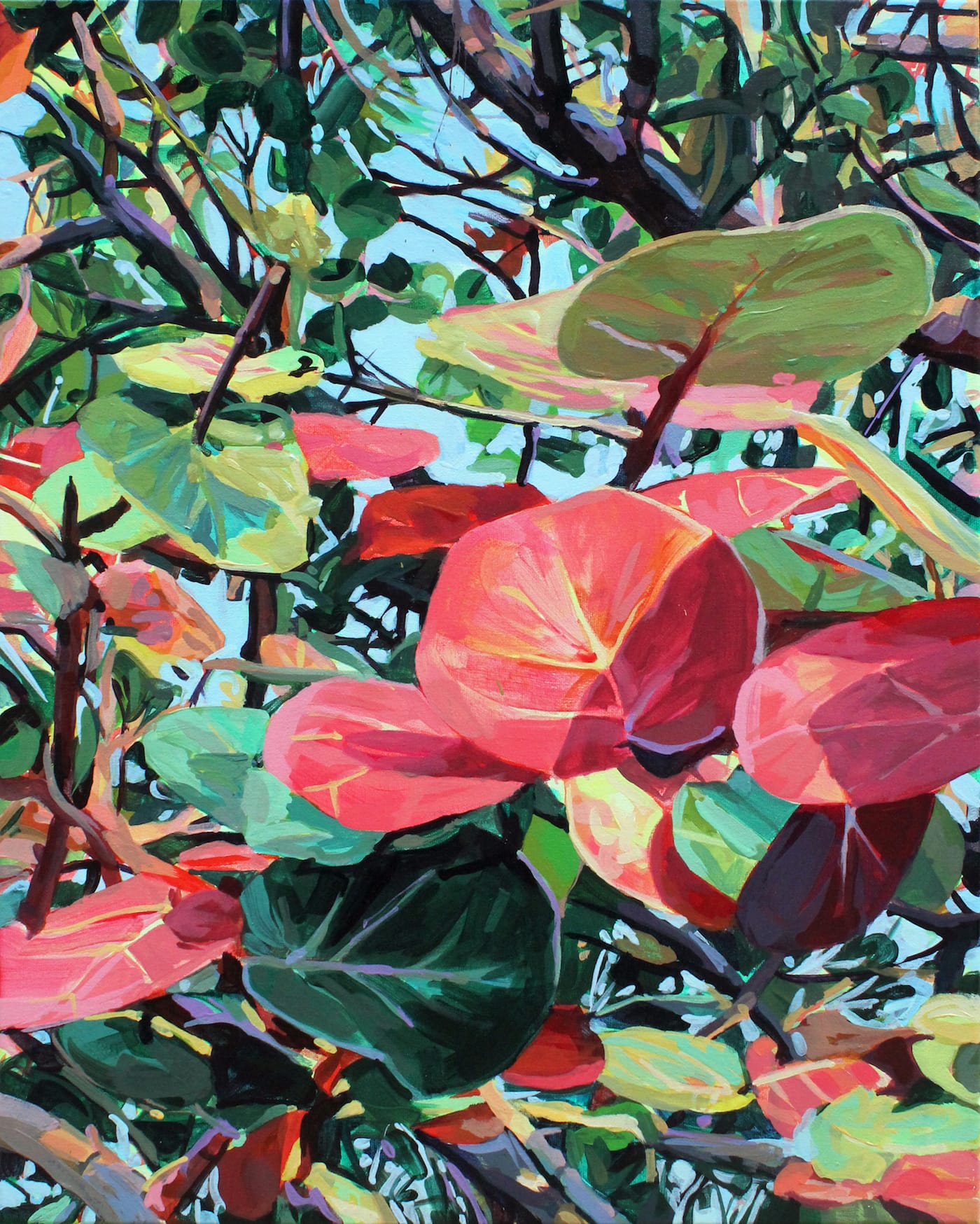 But, truthfully, there’s a collective admission of its sheer aesthetic loveliness, by both inhabitants and — we think — tourists. The landscape is beautiful, especially on first glance — and then on your second, and third, and again and again. Florida is green-blue as a stone and just as precious; like ink in water, sunsets here appear perpetually in motion, multiple strata of red-pink clouds forming a kind of visible heaven. The 12 landscapes comprising The Magic Hour, which mostly depict sea grape trees, are limned with reverence, but there’s also the microscopic gaze — and indeed awe — of someone as curious as he is mystified. The gaze is set just below the length of the sea grapes’ crowns, sometimes closer, to imply mesmerized, myopic immersion in the climate of a single tree.