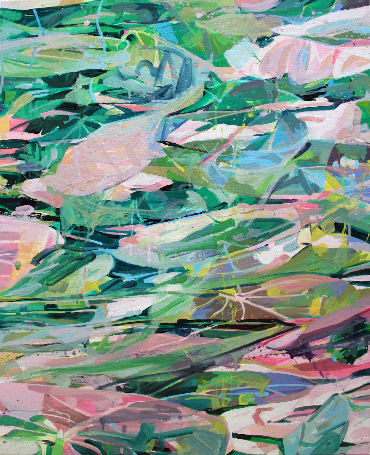 I was long familiar with Perez’s portraits, in which the graphic, bruised strokes of his subjects’ expressions render them sharp, more abstract than figurative. His landscapes, by dint of their close perspective, retain the same sort of abstraction. Perez, it’s said, draws from the Florida Highwaymen, the black painters illustrating the banyans and waterways of the state in distant postcard views. More accurately, he narrows their scope and zooms in, sometimes to a single veined leaf, as if one’s nose was pressed there. The foliage of a tropical landscape is dense enough to feel like a snug embrace. Perez, as it were, paints from inside the clasp.