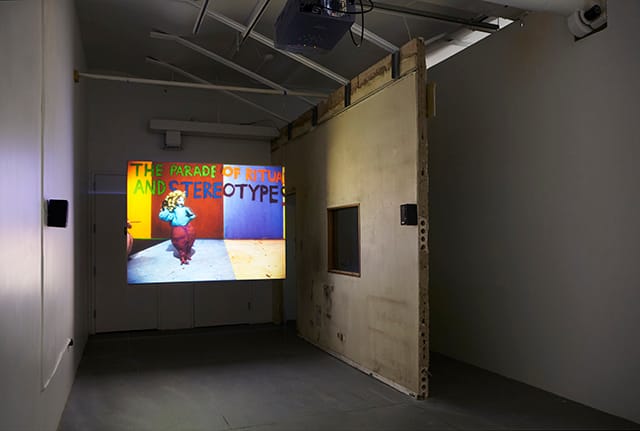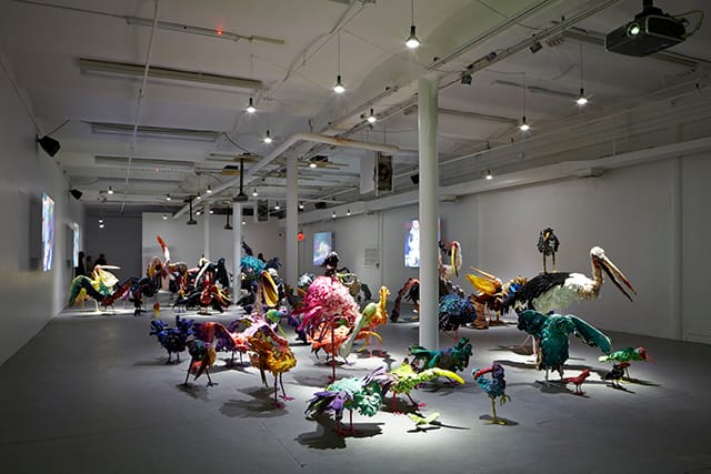 Five films are projected on the side walls of the large, deep front room of the museum’s new street-level space, Studio 231, three on the north wall and two on the south. A sixth film, “The Parade of Rituals and Stereotypes” (2012), which is almost eleven minutes long while the others average around six, is hidden away in a rear gallery. Crowding the floor of the front room are eighty-two fanciful, multicolored birds that look as if they’ve just fluttered down from the Claymation screens.