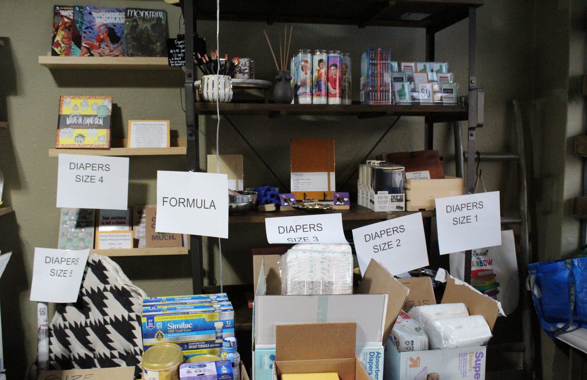 On January 9, Nikki High, owner of Octavia’s Bookshelf at 1353 North Avenue in Pasadena, shared on social media that her doors were open, and within hours people came to connect to her wifi and charge electronics. With the help of local volunteers, she directed traffic and orchestrated drop-off and pick-up of donations. Inside the shop, supplies were organized on bookshelves, with signs for tampons and soap against books by bell hooks and Audre Lorde and packages of formula and diapers stacked against Wonder Woman comic books and journals.