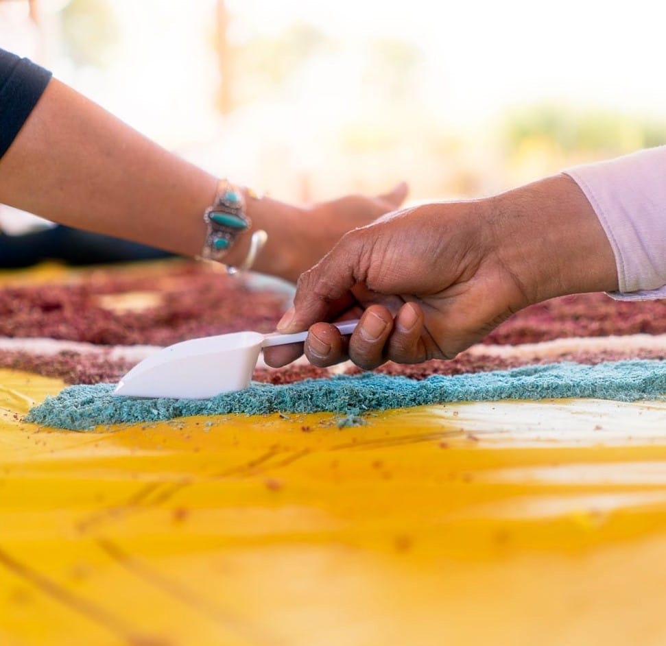 One example of the shifts taking place is holding on-site workshops at Gordon Bernell Charter School and Native American Community Academy (NACA). Current teaching artists Haley Greenfeather English (Red Lake and Turtle Mountain Ojibwe) and Grace Rosario Perkins (Diné and Akimel O’odham) are working onsite at Gordon Bernell for a very practical reason: As a Job Corps site, program requirements obligate students to remain on campus. The decision to teach onsite at NACA was informed by transportation issues that students experienced during past workshops.