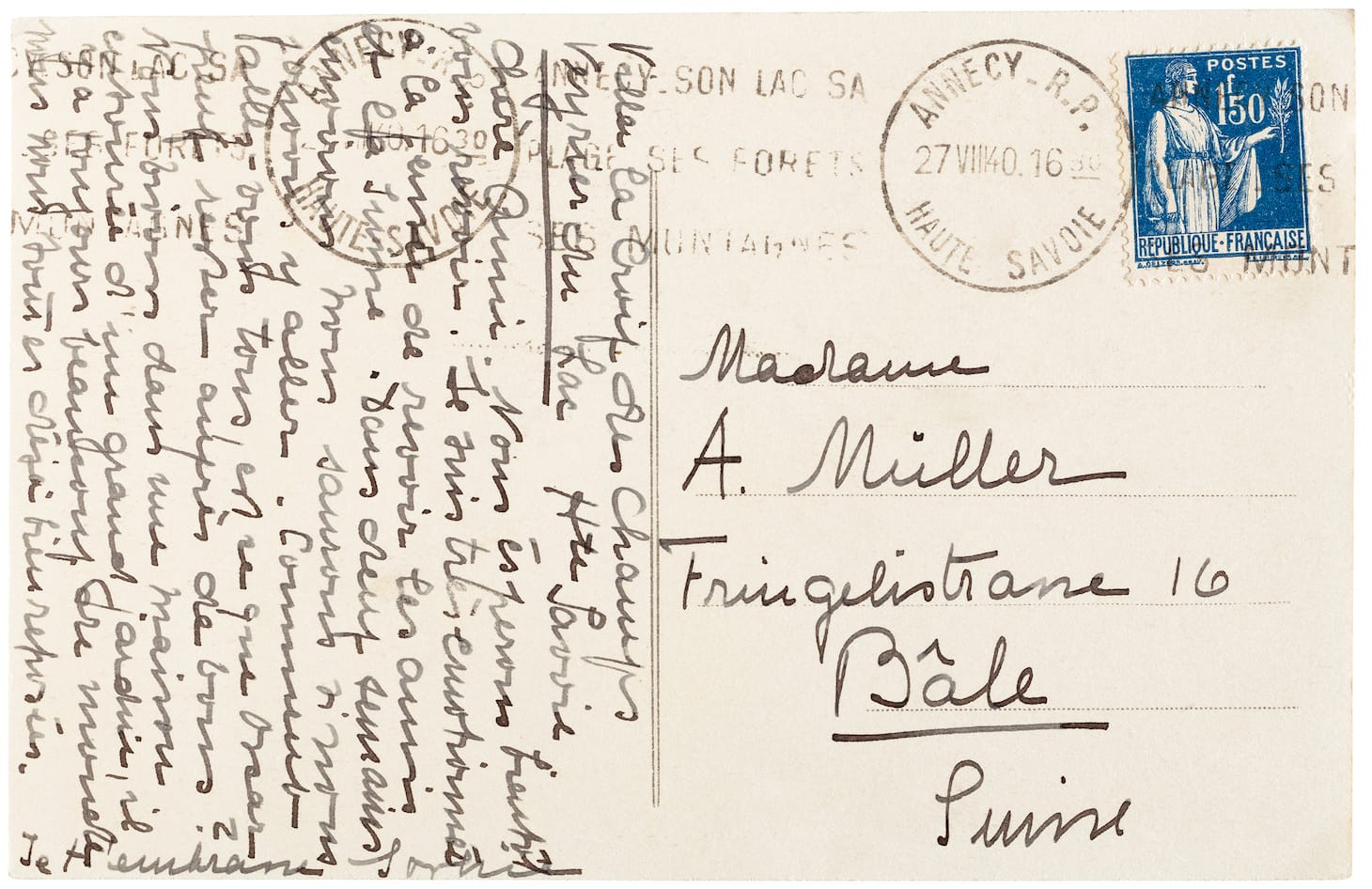 Beyond presenting the ways in which an artist couple rich in creative capital could scratch the backs of an established Swiss professor of dentistry and his connoisseur wife, and vice versa, these letters are a testament to the tumultuous period leading up to WWII. On sheets of paper or postcards illustrated with mythic Provençal dragons, Taeuber-Arp narrated her experience of being a refugee during World War II — a testimony that feels especially timely given the current war in Ukraine.