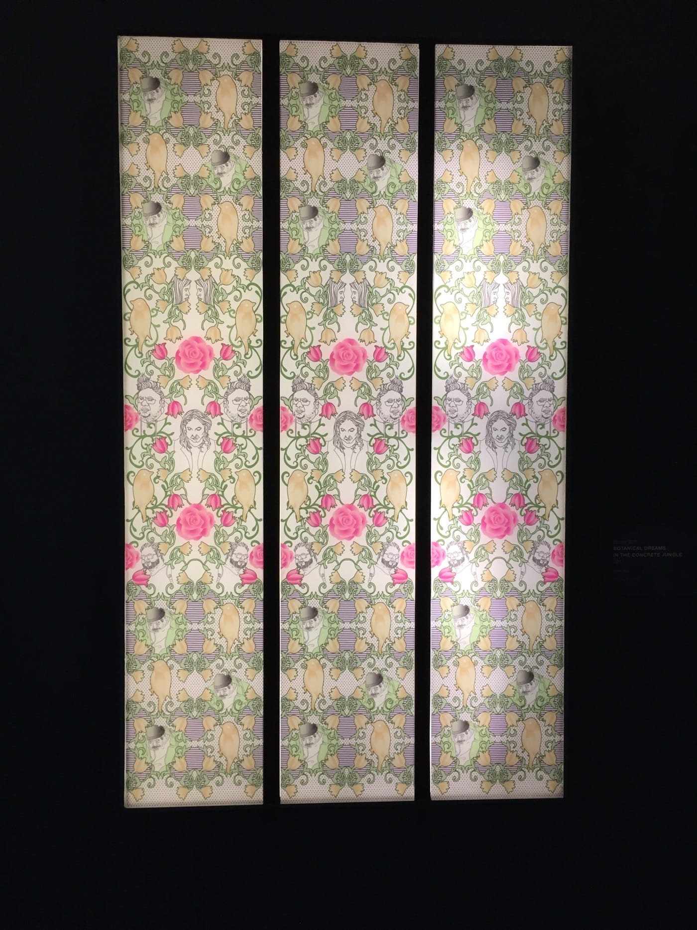 Both Nancy Blum and Ebony Bolt use botanical imagery. Blum focuses on the robustness and bravura of the forms. Bolt relies on the trellis as a backdrop for a wonderland of city characters wearing expressions that endlessly recur. The repeated pattern of the wallpaper simultaneously underscores the gritty reality of her city streets and their beauty. Bolt’s juxtapositions gently tug charm from the most unenticing faces, elevating them, and her latticework holds growth which yields inventive possibility for the city.
