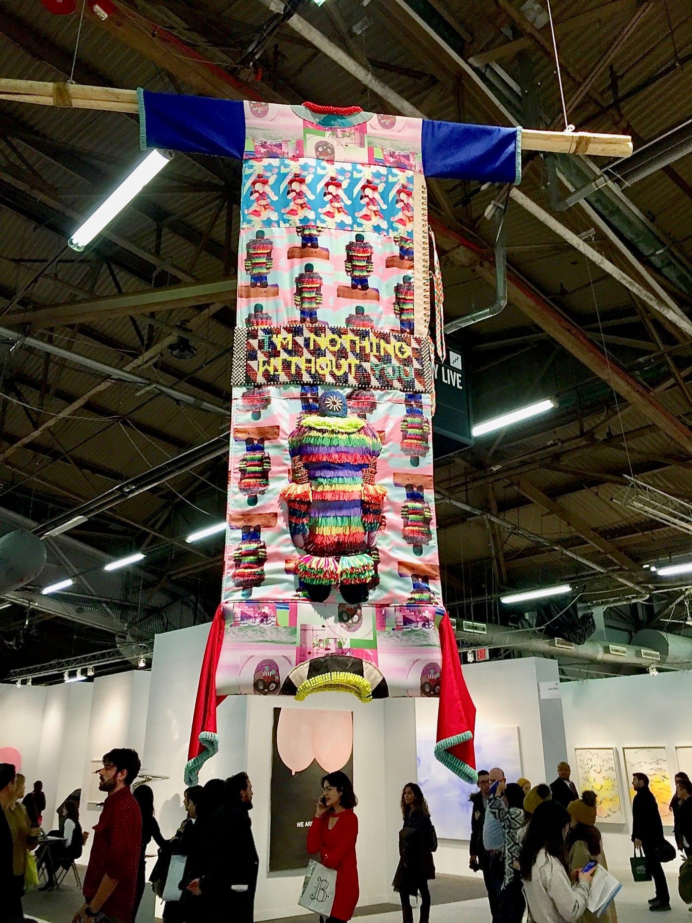 In the Armory show, at the Wentrup Gallery booth, Nevin Aladağ’s “Social Fabric” of 2017 is typical of this Turkish artist’s interests in pastiche. She combines carpet pieces of Iraqi, African, Chinese, American, and other origins to crossbreed the patterns, highlighting the funky, sexy look of abandon and imprecision. Also, Sanford Biggers had a strong presence. Biggers’s patterns and textures sumptuously occupied the David Castillo Gallery booth with four quilt-based wall works, a wonderful decoratively patterned linoleum floor, and a feather-covered sculptural figure, as well as smaller pieces on the outer walls. Reached at the American Academy in Rome, where he is currently a Fellow, Biggers claims his connection to Kozloff, Schapiro, and P&D openly: