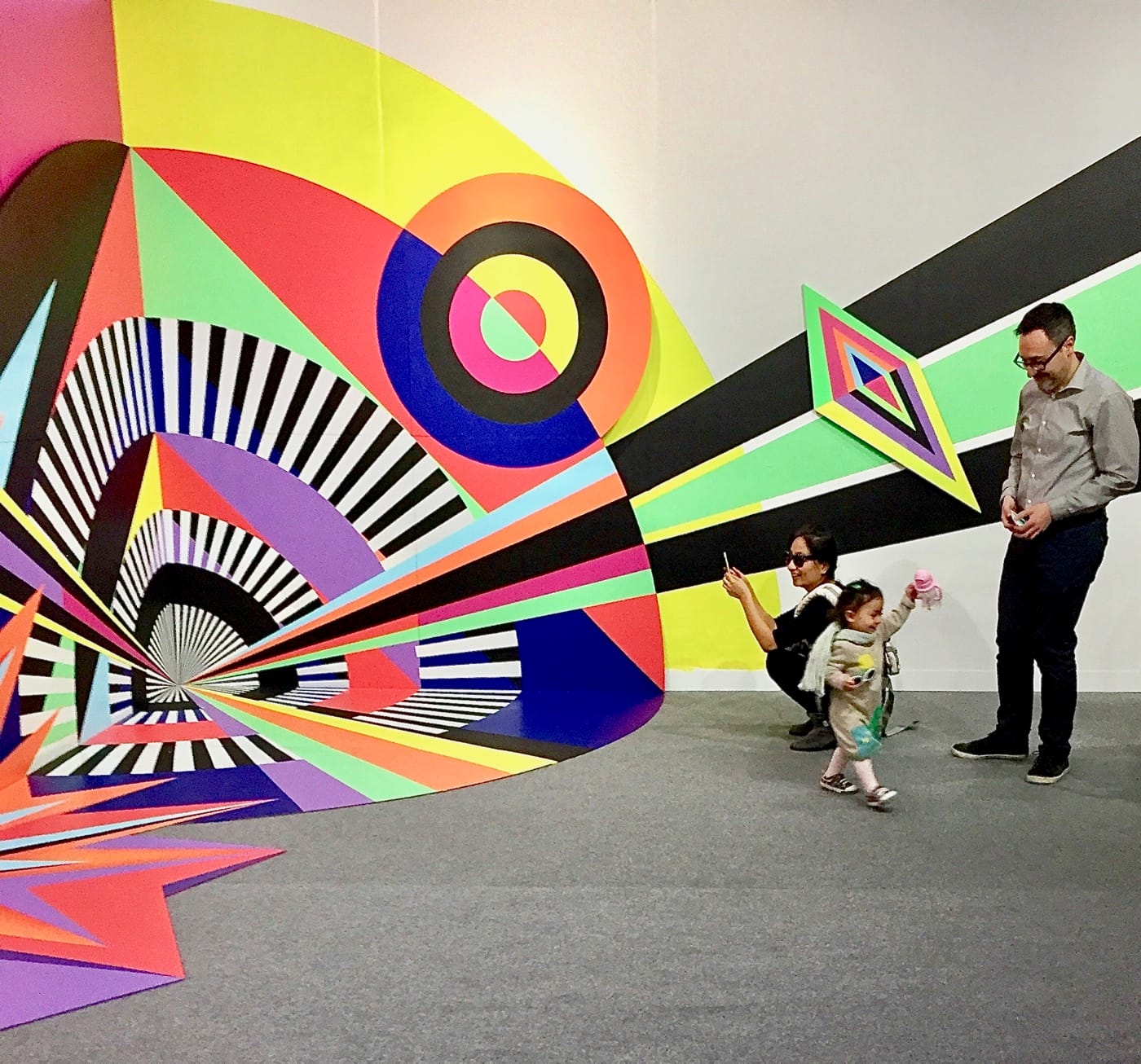 Brilliant color and gorgeous patterns seemed a leitmotif in works by several artists at the Volta and Armory art fairs in March of this year. At Volta, KiiK Create, the collaboration of artists Manoela Madera and Gray Edgerton, occupied a space with its signature fetching, vibrant geometric installations. Highly graphic in bold outlines of the forms, the severe diagonals animated the space, thereby attracting small children wanting to play in the booth.