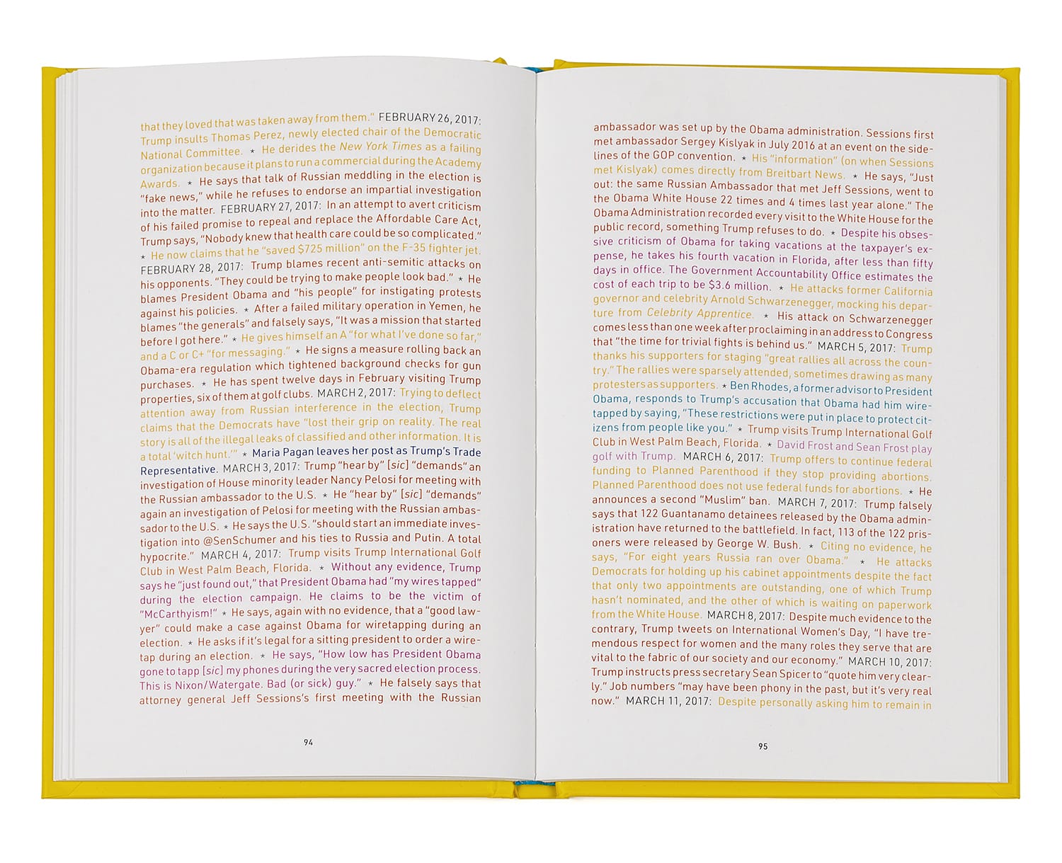 RK: I knew from the outset that this project would be different in part because, as you say, it was based on a pre-arranged system. In that sense, I became an onlooker, watching as both the content and the look of the piece evolved. The accretion was uncanny, as if Trump were composing the piece unbeknownst to himself. It was somewhat similar to using John Cage’s chance operations while [I was] co-editing his Diary: How to Change the World (You Will Only Make Matters Worse) (2015). As we applied different typefaces, colors, and spacings to Cage’s text, I found that I had to let go of my preconceptions, particularly about the piece’s form. It was a reminder that there are many ways a work can unfurl and that staying open to the possibilities yields surprising results, ones that might not be possible with the imposition of personal taste.