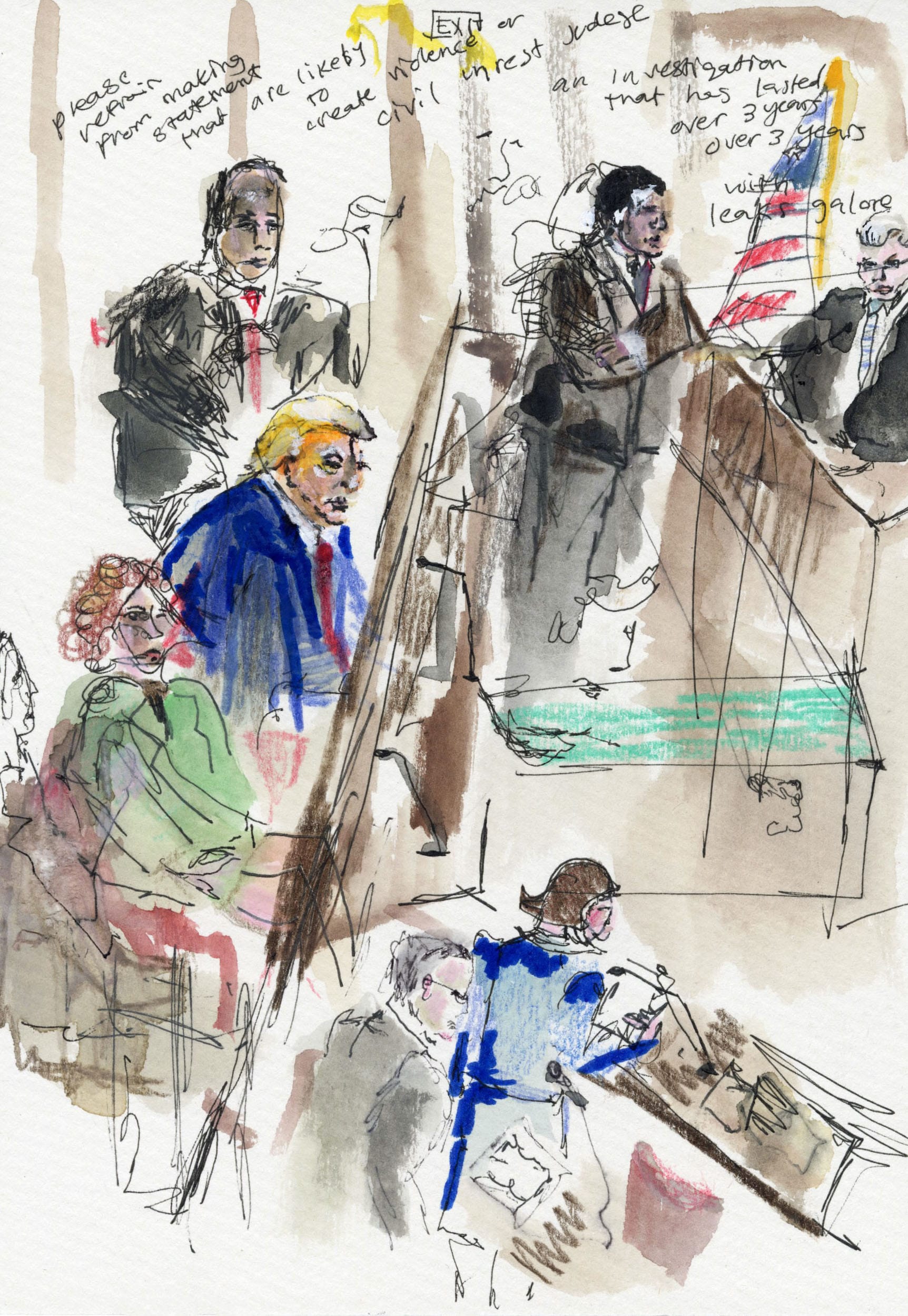 Trump hunches involuntarily in his seat, facing the judge. His groom hovers over him, holding an invisible thread to Trump’s tongue, momentarily canning his chronic platitudes.