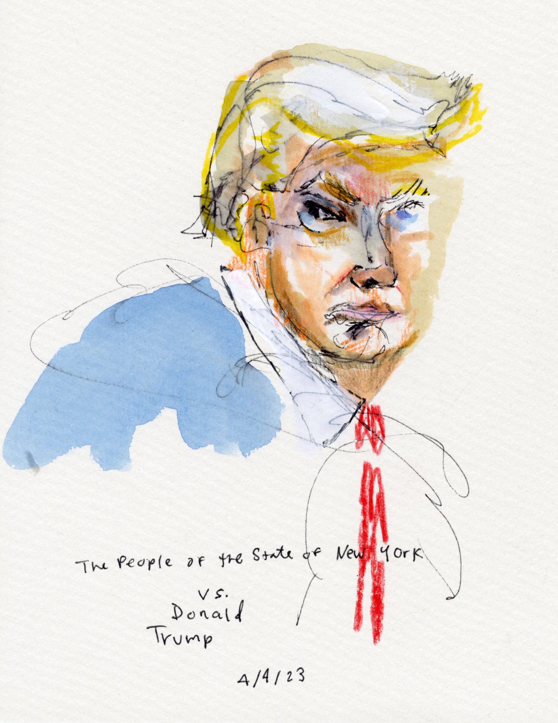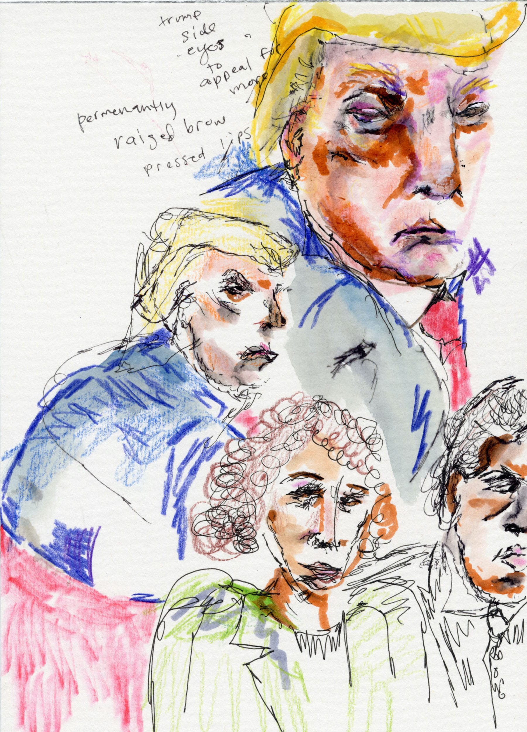 Like Dorothy saw Oz, I see Donald Trump. Stripped of his arsenal, there was no livestream to perform in front of, no phone to echo his belligerence. Restrained to the park outside the courthouse, the sounds of his protesting base are abstracted but still audible from the 15th floor. I study Trump’s colors and grab pens and pencils in shades of blue, orange, red, and yellow. His face is tan with bright white raccoon rings around his puffy eyes. The glazed marbles turn slowly in their sockets without the rest of his head. His hair is as thin as phyllo in varying shades of yellow and sand and is perfectly blown out into one thin layer placed stiffly over the surface of his head. His lips are small and pursed sourly, casting a shadow over his chin. His eyebrows are up wrinkling and reddening the center of his powdered forehead. He hardly moves or speaks, but when asked how he pleads, he leans forward and utters the words “not guilty,” instantly memorializing an unprecedented moment in our nation’s history.