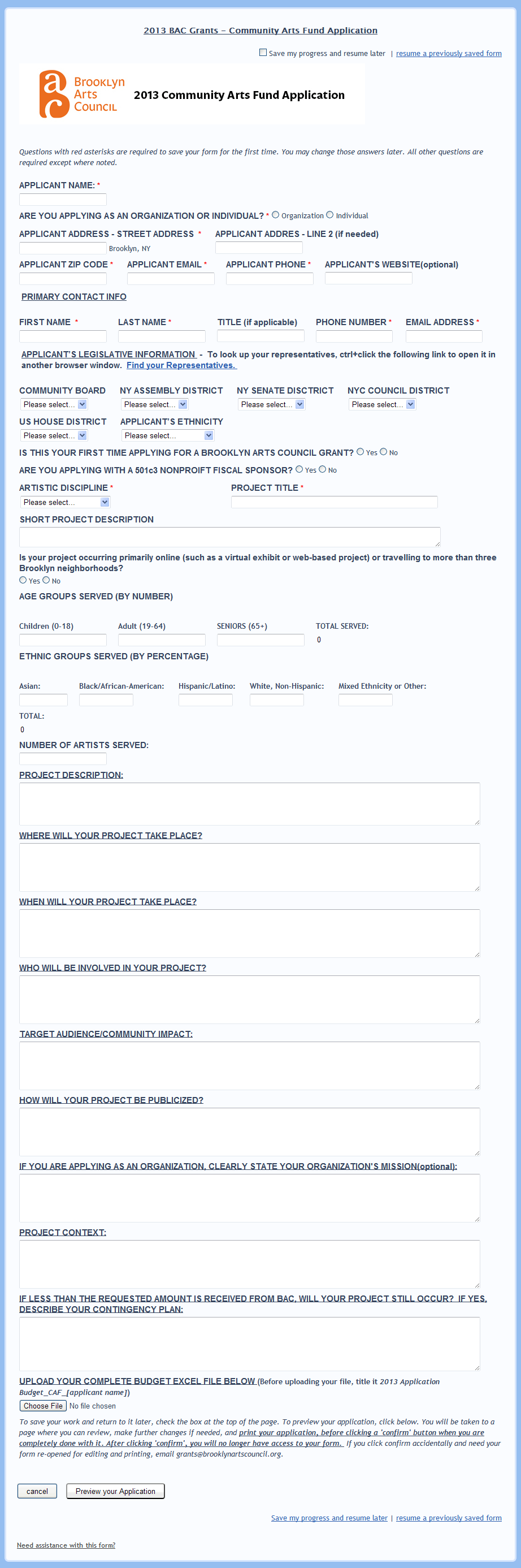 There’s an application process that you have to go through to apply for the BAC Community Arts Grants, with eligibility requirements, and mandatory attendance at one of the seminars that take place all over the borough where they explain the whole process. Again, pretty standard these days, though few organizations require the informational seminar — that’s another example of the BAC trying to make sure people have the support and info they need to get through the application process, which many funding organizations are not good at, at all.