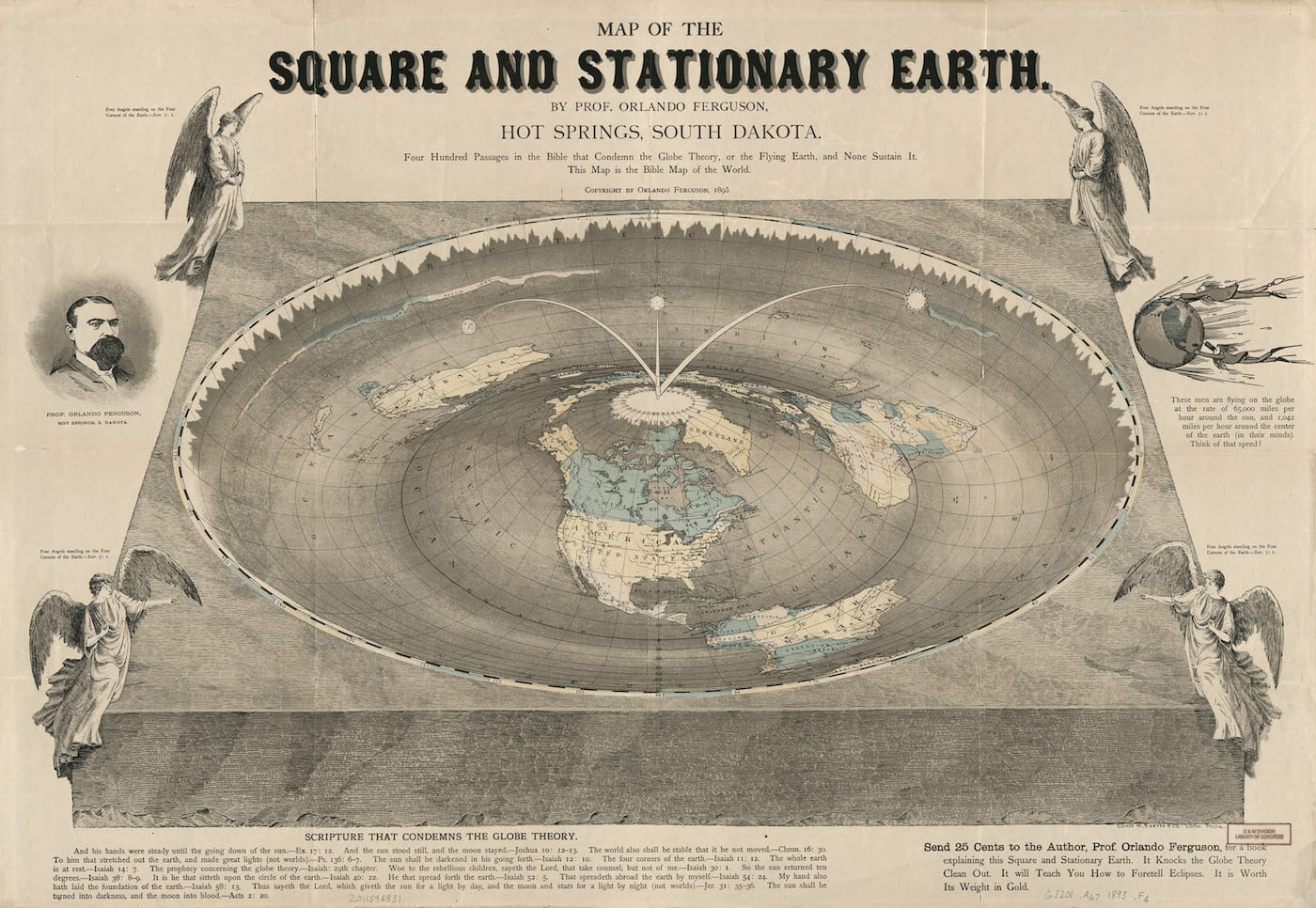 Mythical islands were often copied by mapmakers, who, for instance, could not easily voyage out to the Southern Hemisphere to see if it did indeed have the giant Terra Australis continent. The Phantom Atlas includes Hy Brasil, recently the subject of a Boston Public Library exhibition, which stayed on maps for five centuries, and had tales of a sorcerer who lived with huge black rabbits and, later, UFOs. Although Brooke-Hitching features extremes of credulity, like a 40-foot “sea worm” that roamed the shores of Norway on a 16th-century map by Olaus Magnus, he also cites more recent mistakes. Sandy Island was recorded in the eastern Coral Sea by a whaling ship in 1876, and it wasn’t until November 2012 that it was deemed fictional. And in the 19th century, there were still those who believed in a flat Earth, such as Professor Orlando Ferguson of Hot Springs, South Dakota, who in 1893 illustrated a map arguing for this planar view of the planet, which he based on biblical texts.