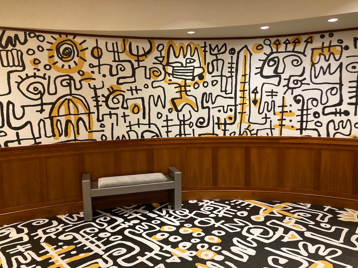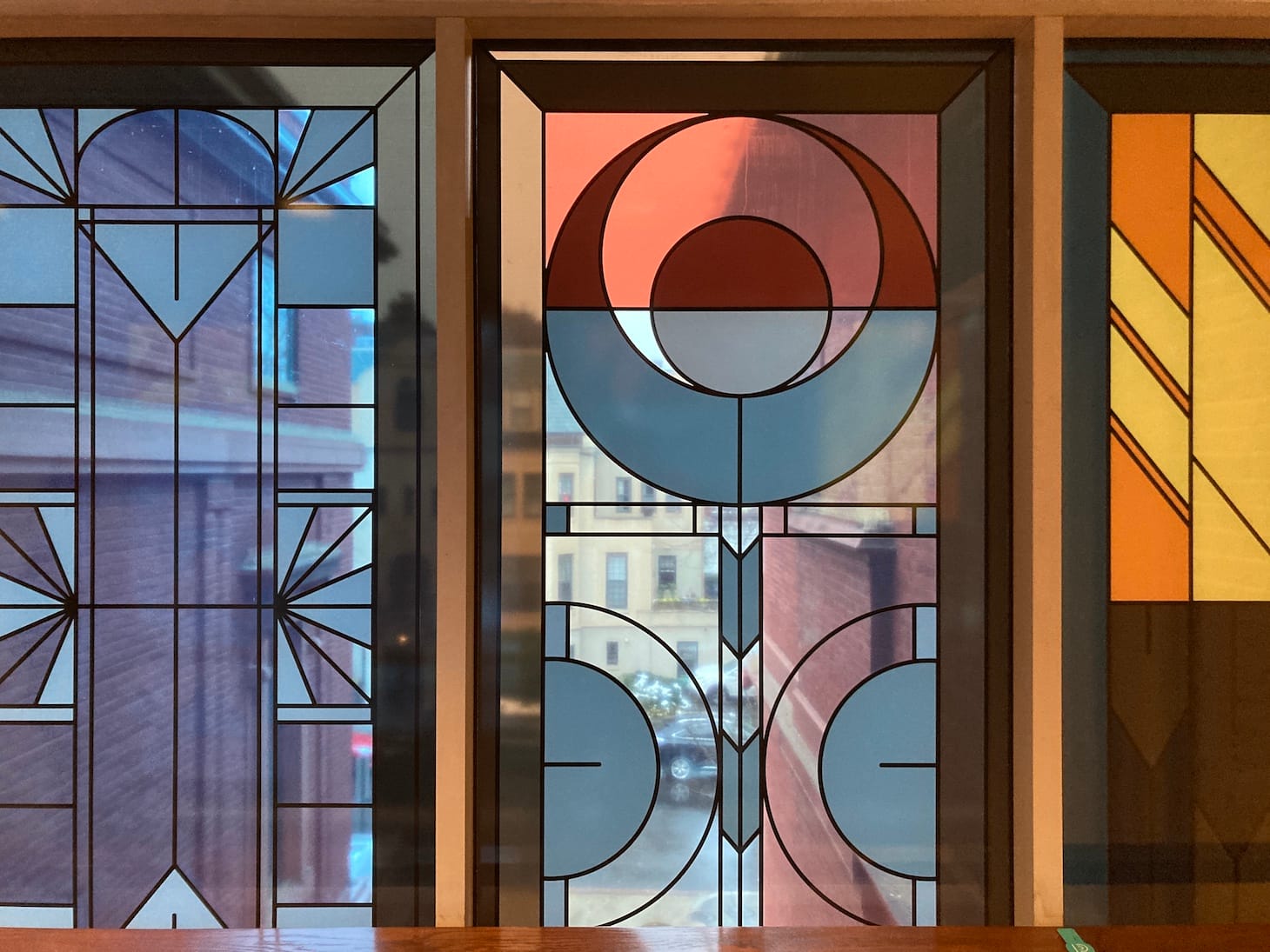 To complement these tentpole exhibitions, the Phillips Collection commissioned special projects by Black artists who are making work in the District today. The vestibule at the museum’s entrance has been taken over by Victor Ekpuk, a Nigerian-born painter who has based his mark making on the ancient Nigerian proto-writing system Nsibidi. In addition, the museum invited Nekisha Durrett to visually transform the bridges that connect the its two buildings. Durrett applied colored film to the windows in the bridges so they resemble stained glass — the artist’s tribute to Jacob Lawrence’s Migration Series. (The museum also tapped Wesley Clark for an installation at its satellite campus, Phillips@THEARC, but it’s currently closed.)
