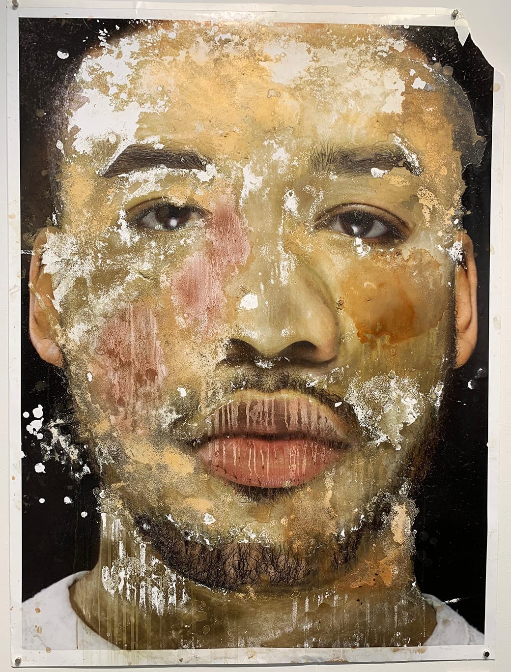 At Arnika Dawkins, Chicago native Ervin A. Johnson distorts tightly framed portraits of young Black faces in his series #InHonor, using additive collage-like techniques. Everything from paint splatters to dirty footprints give his portraits the look of distressed fresco paintings. Despite the current cultural popularity of “retro” aesthetics, these artists are not turning to lost processes to elicit a sense of nostalgia, but seem to be looking instead for clues or do-overs to shape a different present.