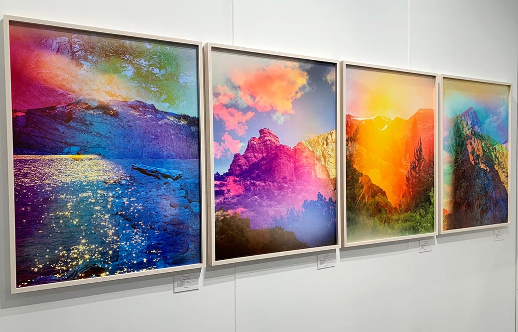 The psychedelic landscapes of Terri Loewenthal at Jackson Fine Art recall a time before Instagram, when Holga-induced light leaks created the distorted world we always craved. Capturing the rolling mountain ranges and sparkling oceans of California, these Psychscapes question everything from traditional landscape photography to Instagram effects like Lo-Fi and Vignette. Delving further into a world of artificial saturation, the works of the French photographer Reine Paradis at Galerie Catherine et André Hug are clearly influenced by a post-Instagram world. Storyboarding her locations before shooting humorous fashion-meets-lifestyle stills, she reduces her images to a tri-color, neon palette. In depictions of a two-dimensional fantasy life, cyan palm trees, cobalt swimming pools, and neon green airplanes critique jet-setter aspirations.