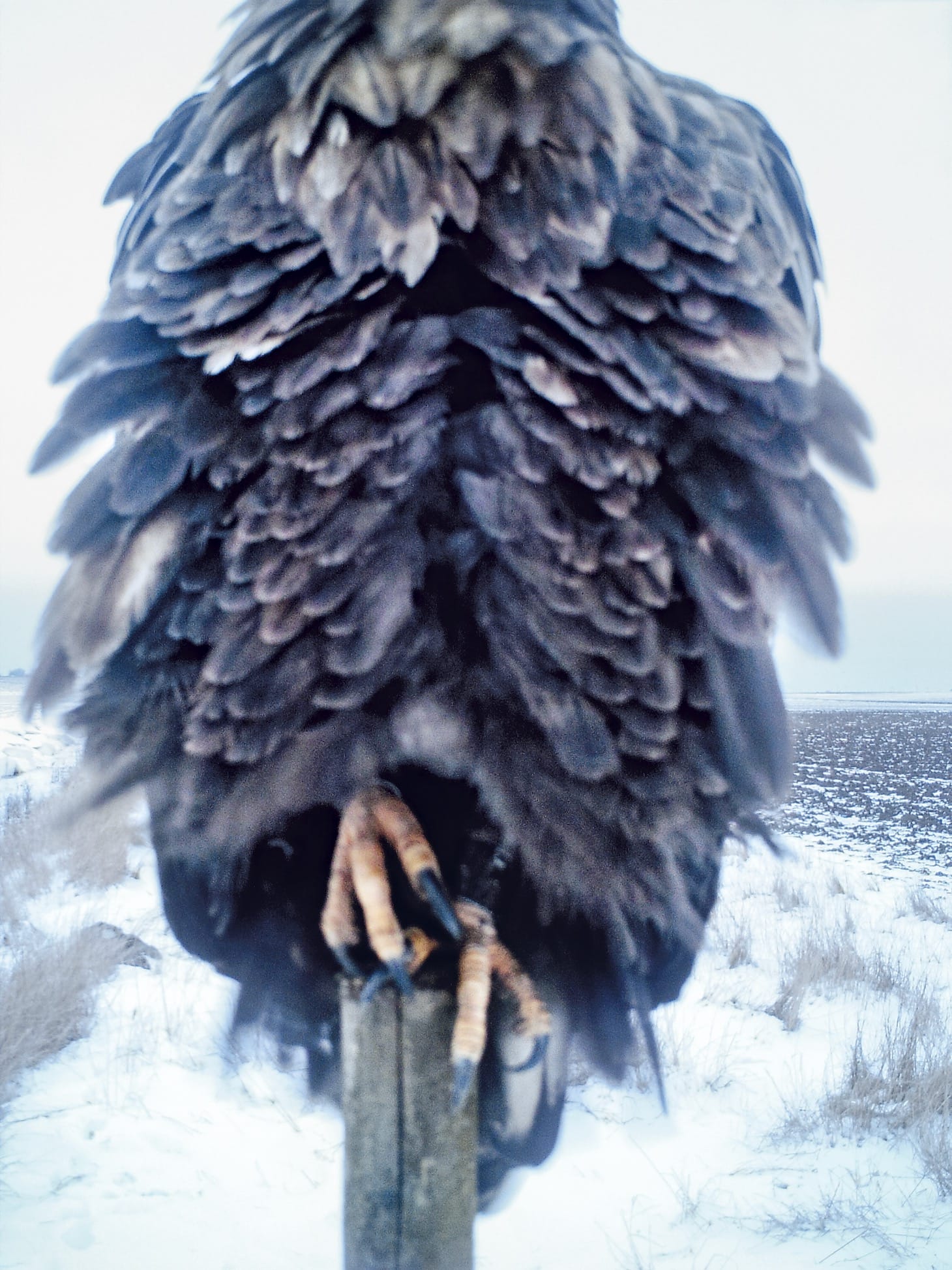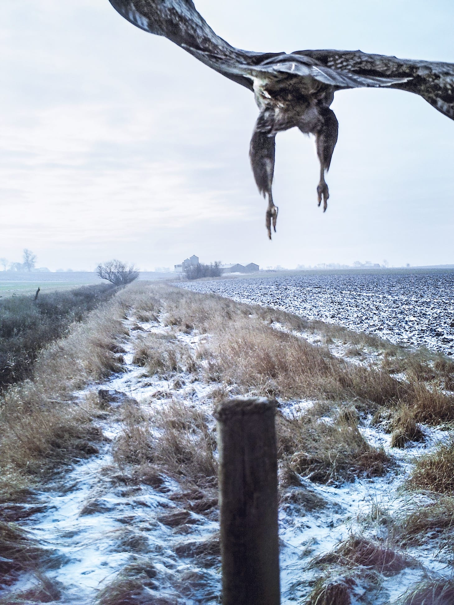 Decades later, Gill has returned to a sort of cable-release system to take pictures of the birds around him, in Sweden, where he lives. These are the pictures that make up The Pillar — hundreds of photos that span four years since he started the project in January of 2015. Every image shows the same wooden pillar, the same field, the same sky through time. What changes are the things that pass through, day after day and night after night: the birds. In some photographs, they appear in droves, sharp, dark streaks moving past the pillar. In others still, crows with milky eyes tear at each other in the dark mist of the night. Some pictures are just blurry feathers pressed against the camera lens.
