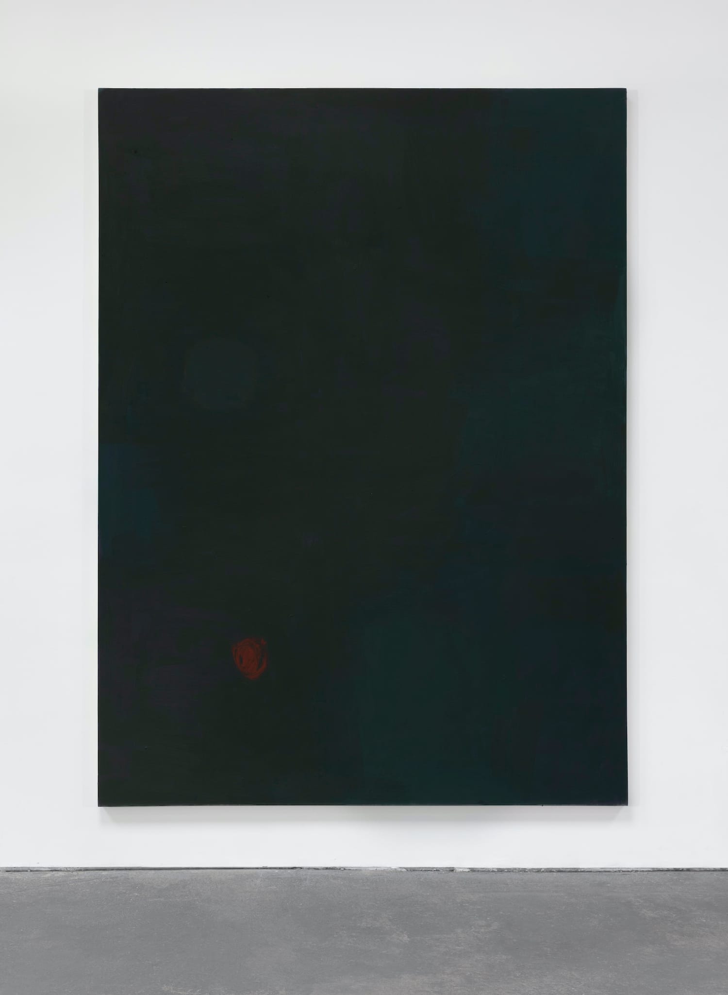 On the left side of “Another Tragic Moment in History (Detail of a Flower Still Life),” directly above the irregular, dark red, gestural orb, a larger, green-tinted orb softly pulses in the blackish ground, through which more green peeks on the other side of the painting. This barely perceptible orb is at once hardly differentiated from what is around it and unmistakably itself. Our inability to fix the spectral forms slows down our looking, making me wish that the gallery had provided a bench that I could sit on as I sank slowly into the painting.