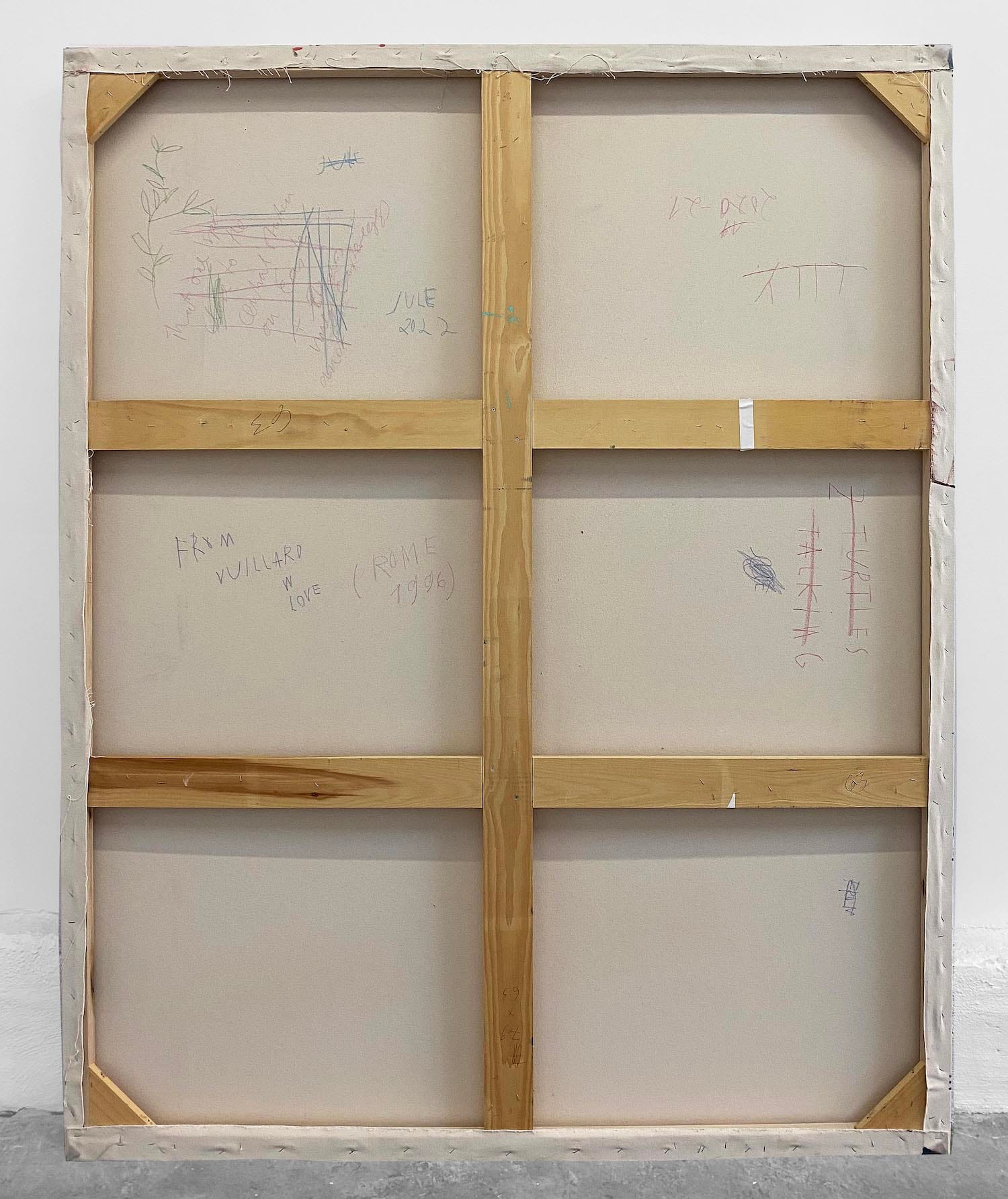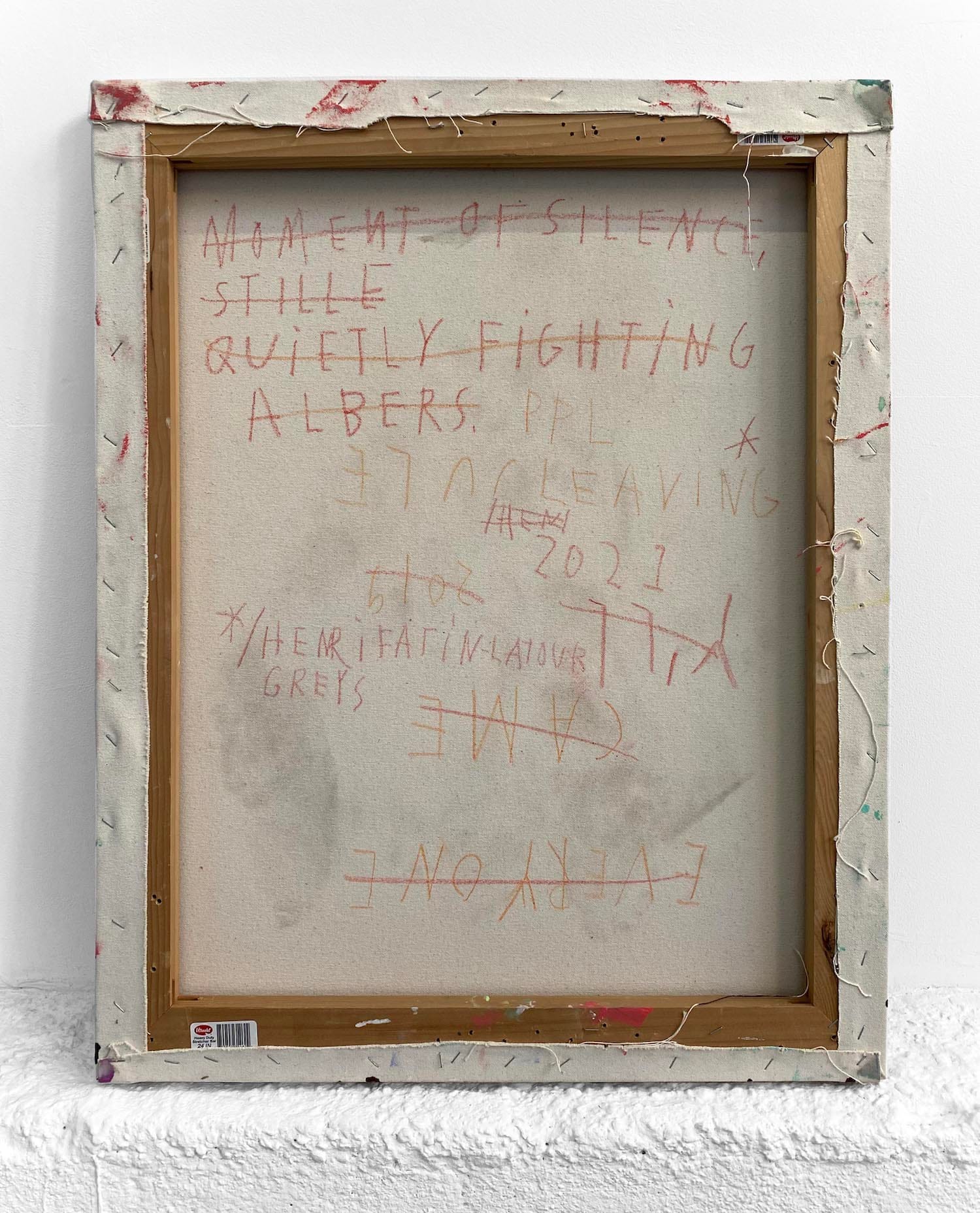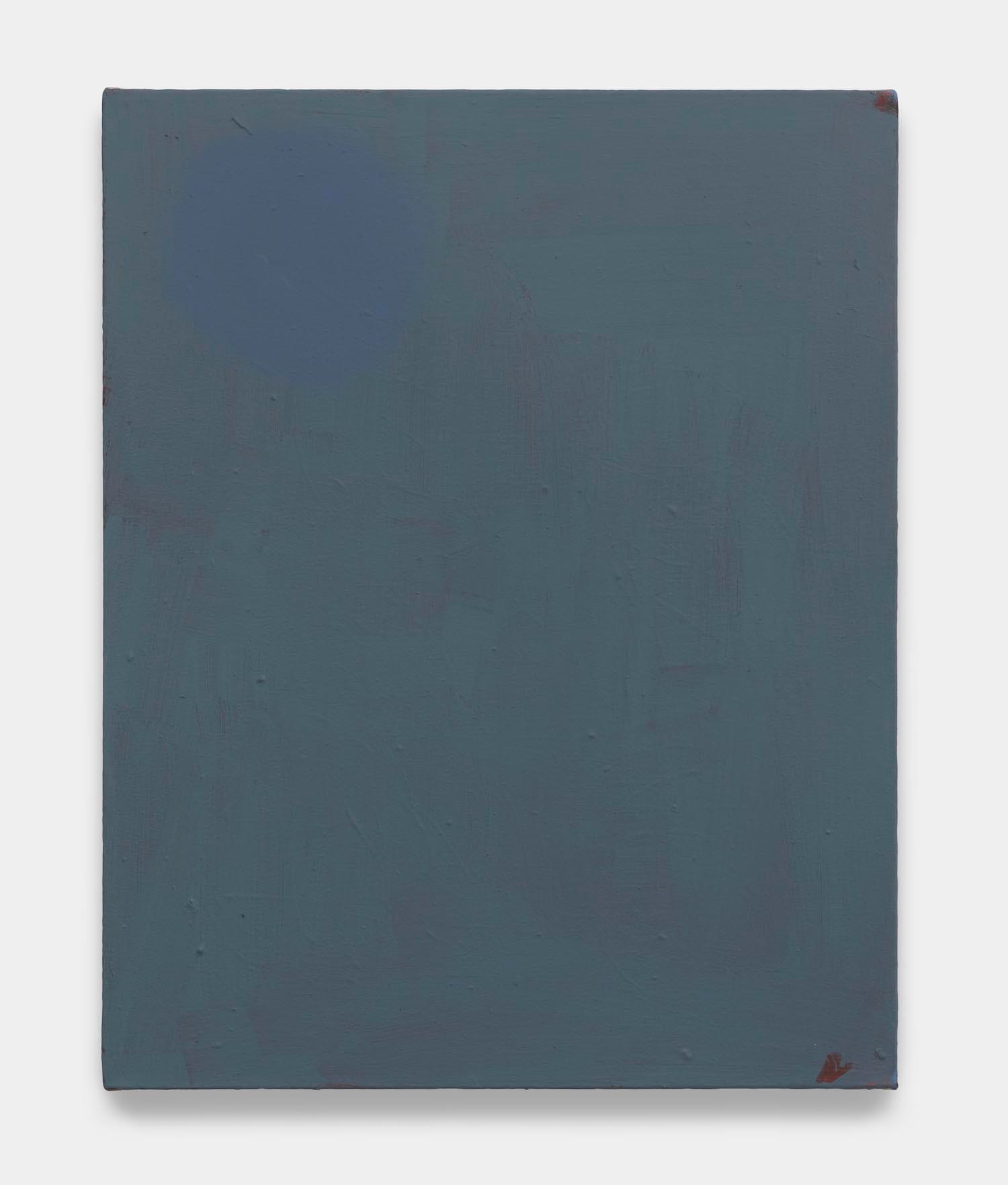 Just as she initiated a dialogue with Heilmann in her earlier work, in this exhibition she calls out to various artists, in both her titles and the record she keeps on the back of her paintings. On the back of the painting “Ppl Leaving (Fantin-Latour Blues)” (2021), Korneffel has written and crossed out “Moment of Silence, Still Quietly Fighting Albers.” A large blue circle floats in the painting’s upper left-hand corner, against a layered ground dominated by an unnamable color that seems to be a mixture of blue, green, and gray. Faint streaks of red peer through, accentuated by a small red daub of a brushstroke in the painting’s upper right corner and a small mitten-like shape floating just above the bottom edge, near the lower right-hand corner. For all the nuances of color, layering of different hues, small and large forms and touches, nothing seems forced.
