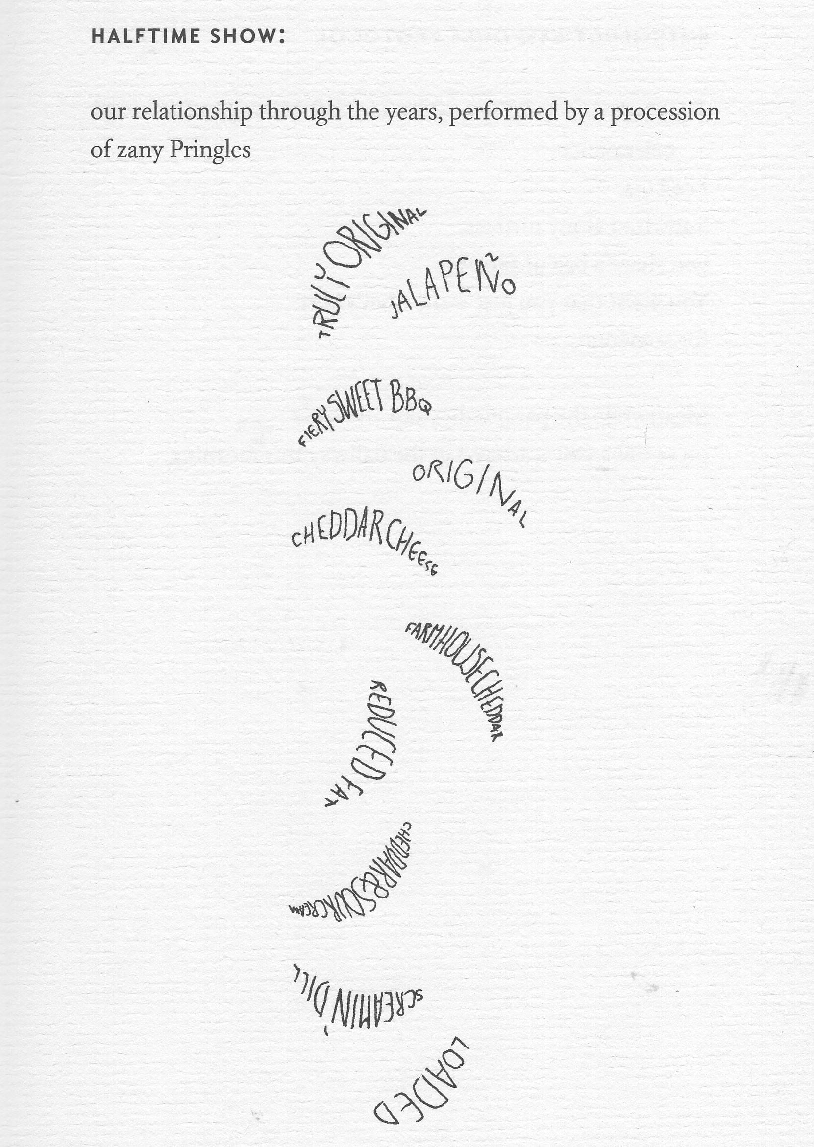 A number of line drawings mimic the blue and green speech bubbles that characterize text messages. One reads, “I just want what’s best for you,” with a bubble interrupting it that says, “don’t say for myself.” This blend of image and text is reminiscent of digital messages, spattered with icons of purple crystal balls, red emergency sirens, and clanking beer glasses, all of which are contextualized by the content but are still open to interpretation. For instance, “Half Time Show,” in the first section, “Food for Thought,” opens with the description, “our relationship through the years, performed by a procession of zany Pringles.” Names of flavors written in the shape of chips fall down the page: “TRULY ORIGINAL,” “JALAPEÑO,” “SCREAMIN’ DILL,” and, finally, “LOADED.” In this and other poems, she exploits the many — often humorous — connotations of words.