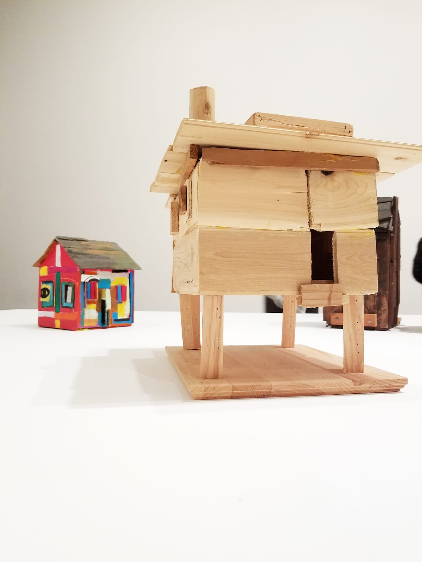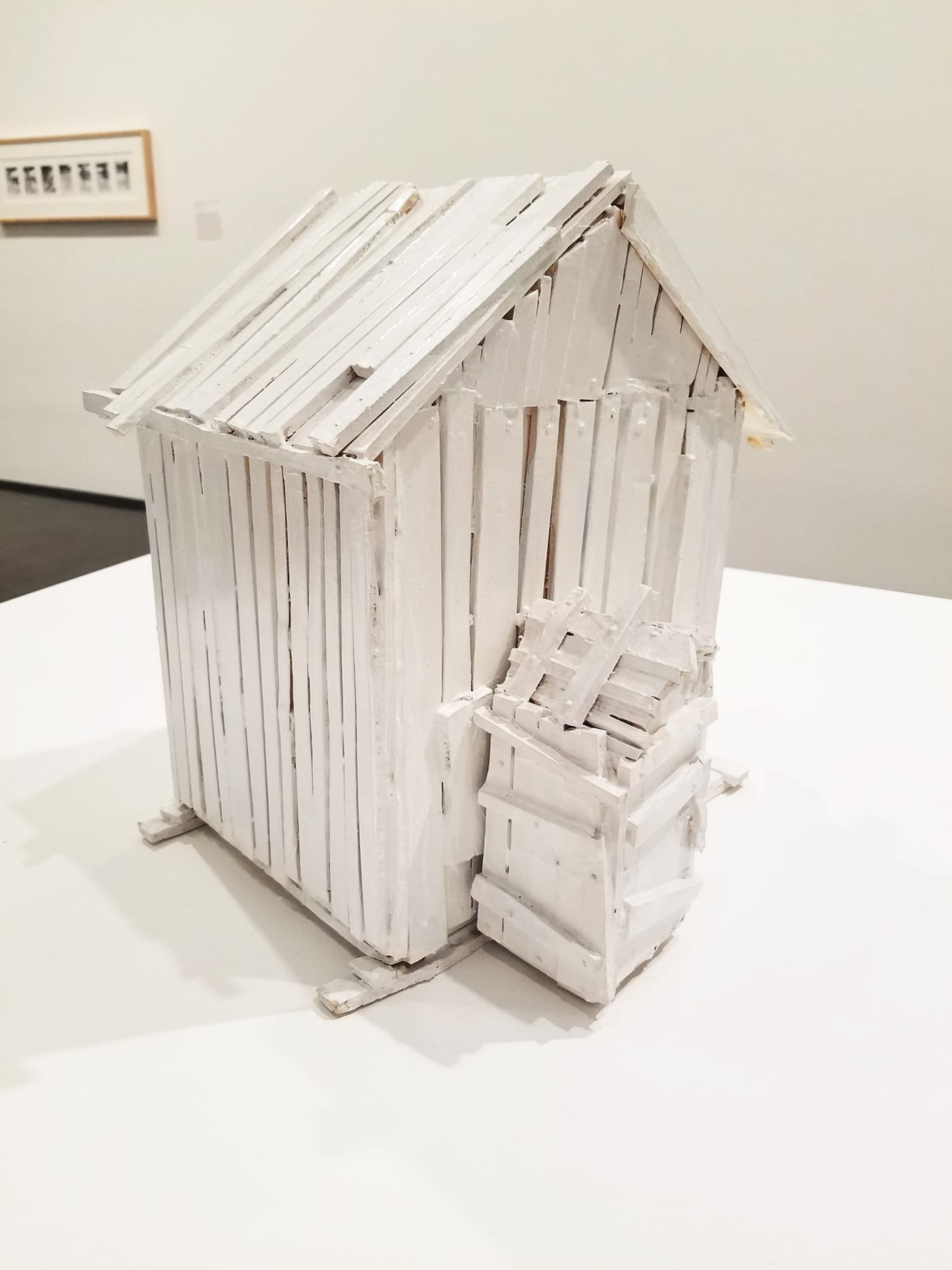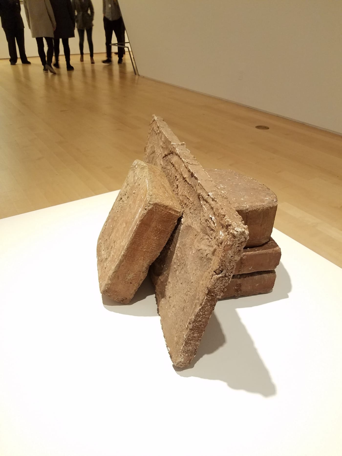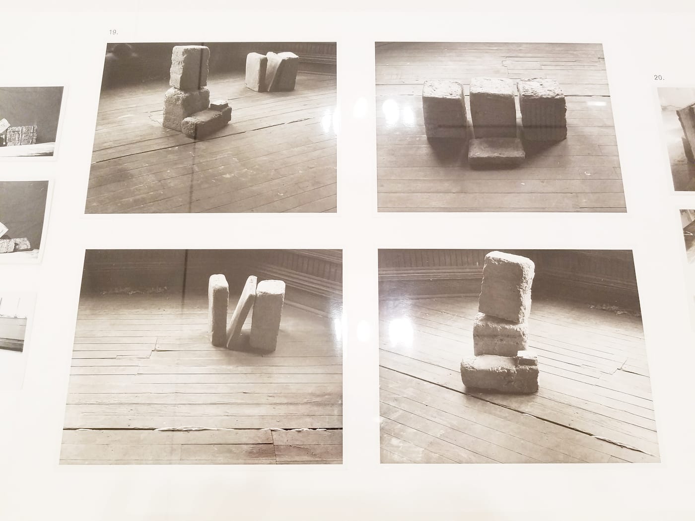 It also does interesting things perceptually. Sharing the space with the video projections are several small sculptures from 1978-81, termed “Frustula” (fragments or small structural pieces), placed on low platforms that, in the presence of the larger, projected images (and fellow museum-goers) assume a thrilling elasticity of scale. The small works sometimes look monumental, as if they had somehow slipped out of the projected images and taken up residency in real space.