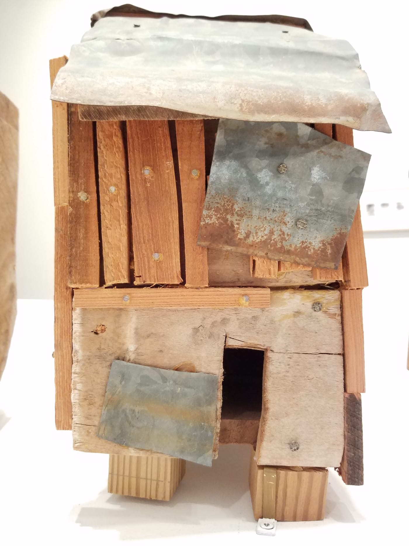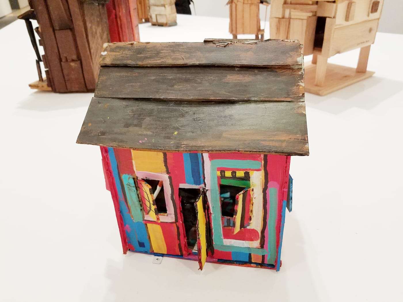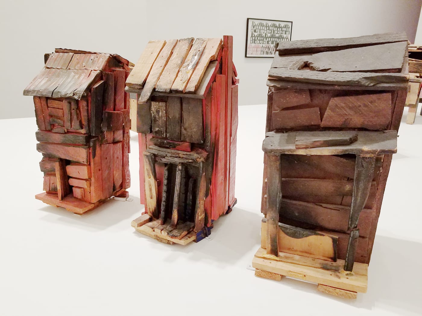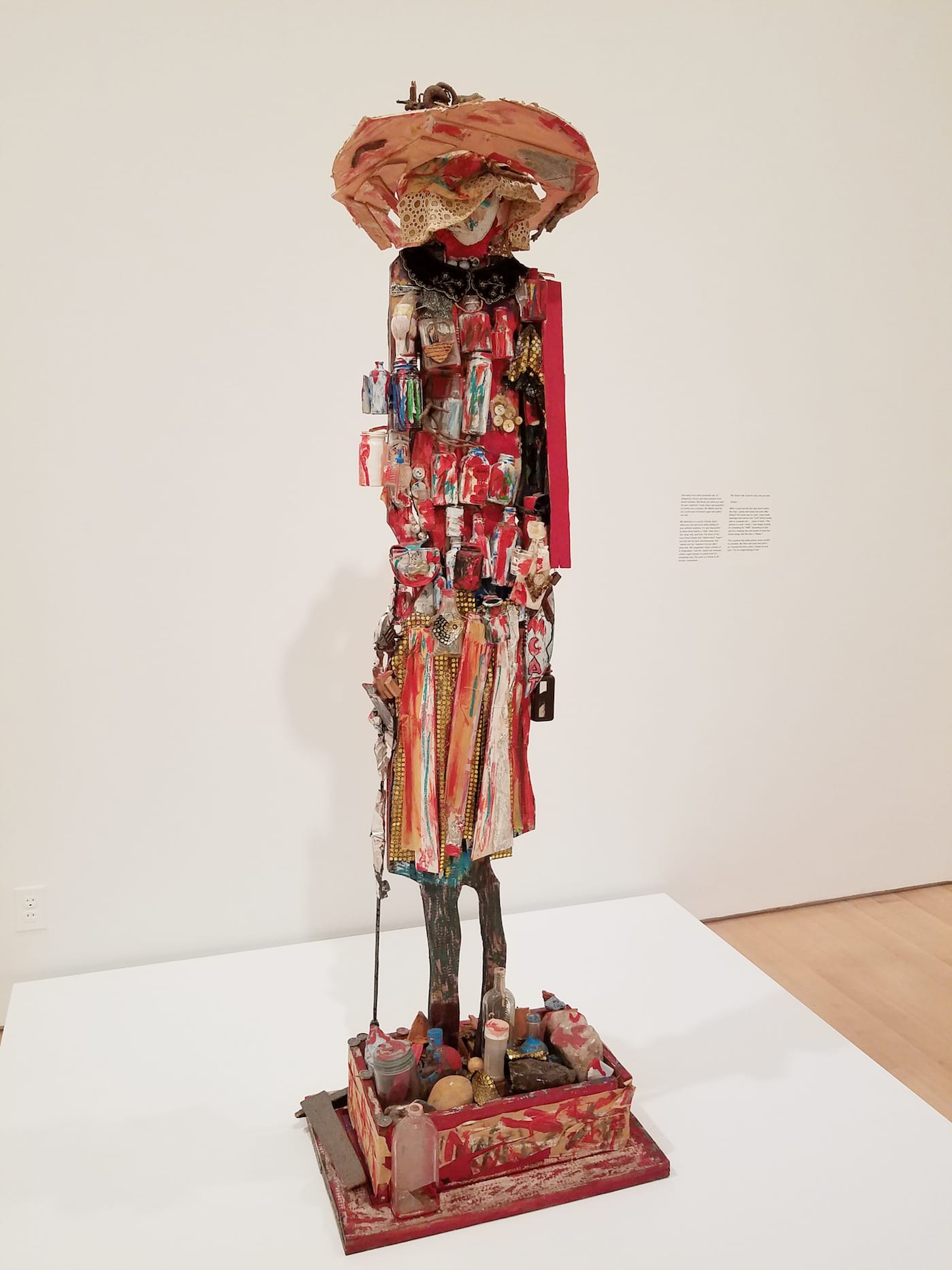 Unexplained by the exhibition literature is Buchanan’s shift, in the mid-1980s, from work like that to the smaller, more materially conventional, and presumably less physically demanding shack sculptures and drawings for which, prior to this show, she has been known. The wall text that accompanies “Medicine Woman” (c. 1993), a six-foot-high figure in a face-hiding hat and a smock hung with empty pill bottles, mentions Buchanan’s “chronic illness,” hinting at bodily limitations.