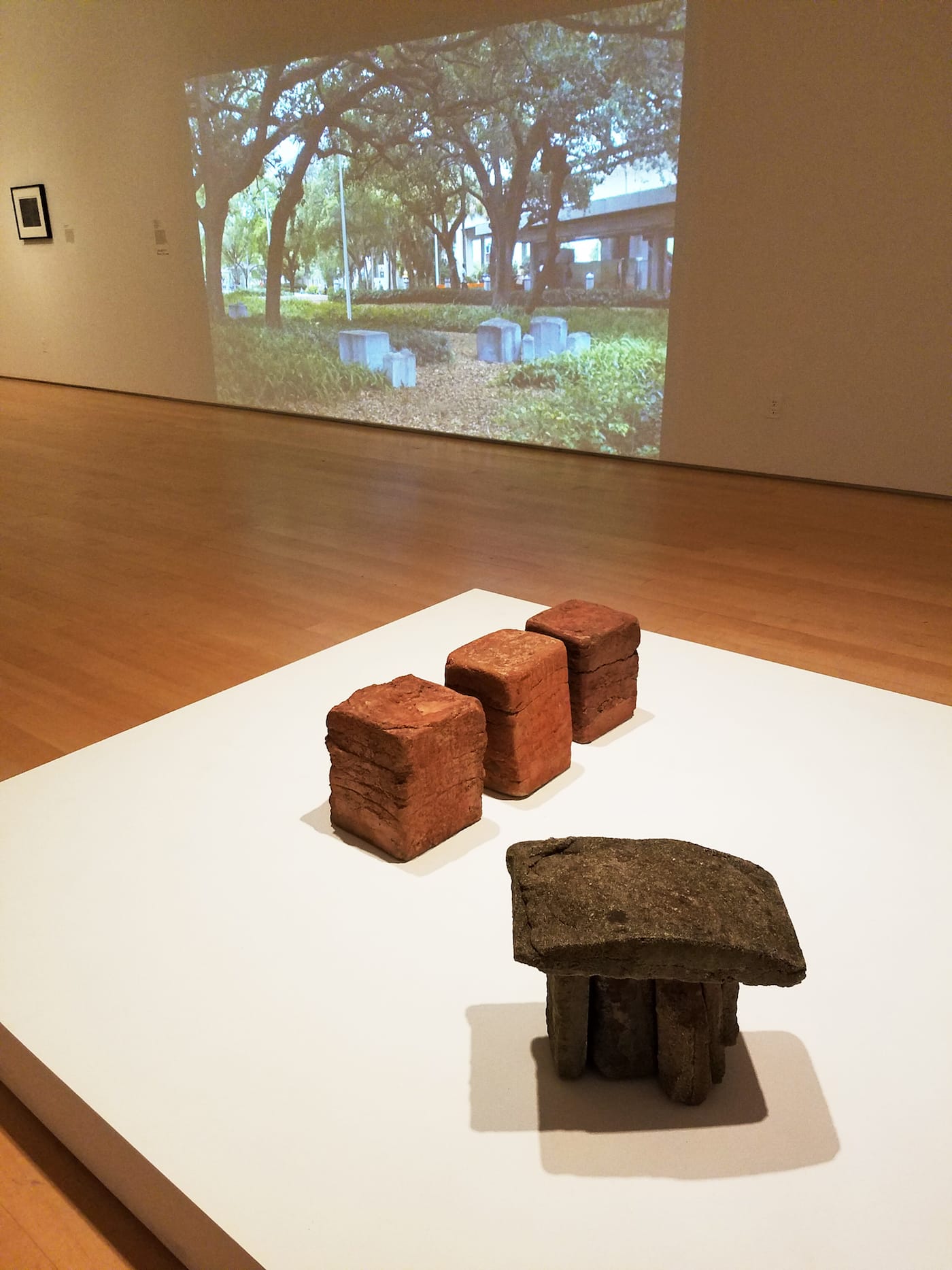 The four projects — “Ruins and Rituals” (1979) and “Unity Stones” (1983) in Macon; “Marsh Ruins” (1981) near Brunswick, Georgia; and “Blue Station Stones (1986) in Miami — are shown sequentially in three simultaneous projections. They are framed from various perspectives and distances, from establishing shots incorporating the local architecture and streetscape, to extreme close-ups of craggy, timeworn surfaces. The viewer’s physical relationship to the projected images — near and far, direct and oblique — replay the camera’s relationship with the artworks.