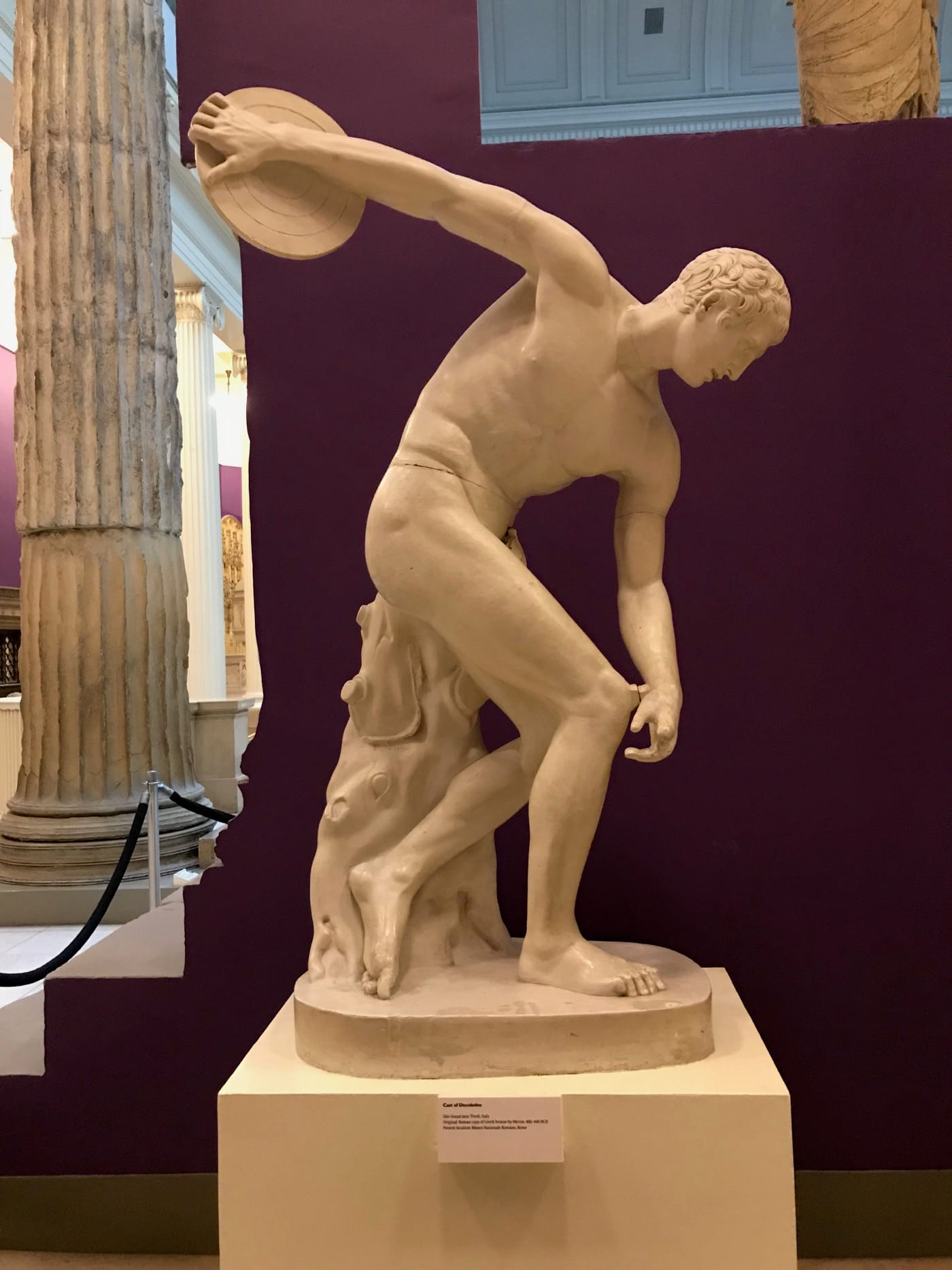 Even today, the “Discobolus” is a familiar form to Americans. In the United States, plaster casts of the statue(s) largely created and sold during the neoclassical plaster craze in the late-19th and early-20th centuries allowed local museum audiences in America to take in the athletic beauty of the “Discobolus” and marvel at his poised muscles. Myron’s dark bronze original has been duplicated in white marble, in plaster, in 3D models, and even in Lego. It has been remarked on by hundreds of authors who have tried to create a facsimile with words rather than with stone.