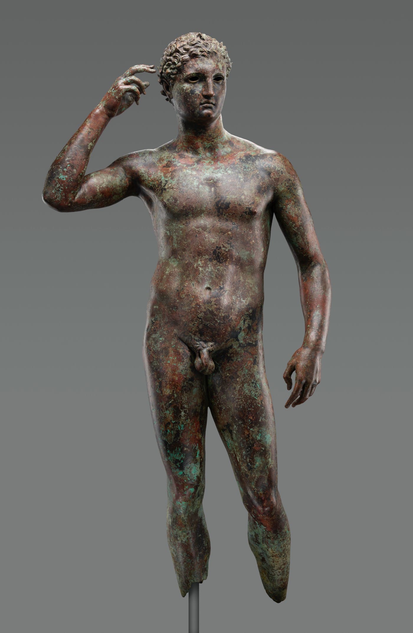 To understand the original “Discobolos” or “Discobolus of Myron,” we must first understand why it was likely created. Many of the statues of athletes that survive from antiquity were originally understood as markers of a victory. Triumphant athletes who competed in Greek agones (athletic competitions) like the Olympics were often awarded the right to erect a bronze statue of themselves at both the place where they competed and also in their hometown — if they had the funds to pay for it. Few of these life-sized bronze sculptures exist today, but a likely example is the Hellenistic “Statue of a Victorious Youth” that now resides, clad as he was during the competition (i.e. in the buff save for a now mostly missing olive wreath), in the Getty Villa in Malibu.