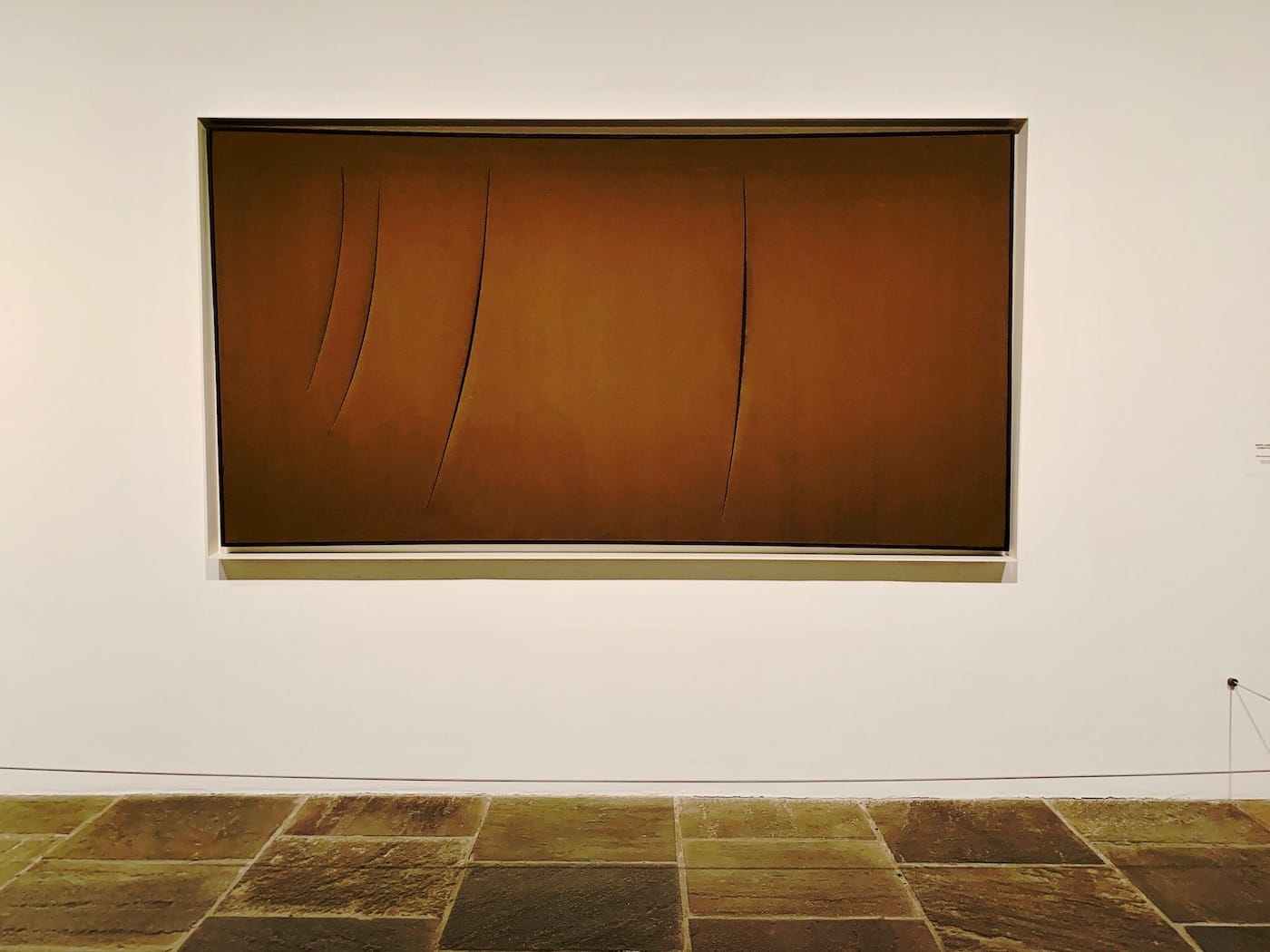 Subsequent galleries that display Fontana’s moves through punctured canvases, ceramics, and pottery are insightful as historical footnotes. In particular, “Spatial Concept, the Bread” (1950) should be celebrated for its grotesque verisimilitude; it looks like something that a young Jean Dubuffet wished he had made. This transition period in the exhibition is brief, and concludes with an expansive showcase of the artist’s trademark slashed canvases.