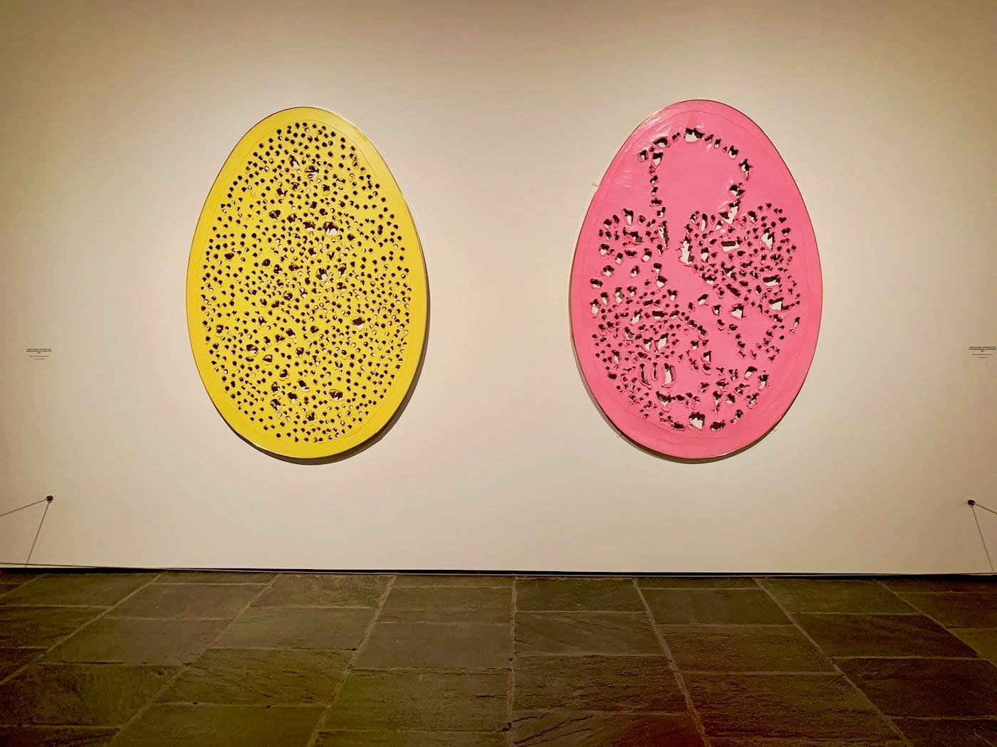 But the perceived purity of the Cuts series is something of a lark. As On the Threshold makes clear, Fontana continued to experiment and evolve as he went — often with middling success. I find the artist’s spatial environments exceedingly boring and outpaced by other light and space practitioners like Julio Le Parc and James Turrell. Likewise, his attempts at slashing bronze also seem off the mark and oddly figurative: One includes New York skyscrapers and the other is a defaced portrait of Greek socialite and gallerist Iris Clert. Fontana also created two glossy, egg-shaped works both called “Spatial Concept: The End of God” (1963/64). Trypophobics beware, these canvases are punctures with hundreds of tiny holes that spread like a disease over their sickly yellow and pink surfaces.