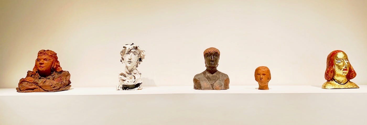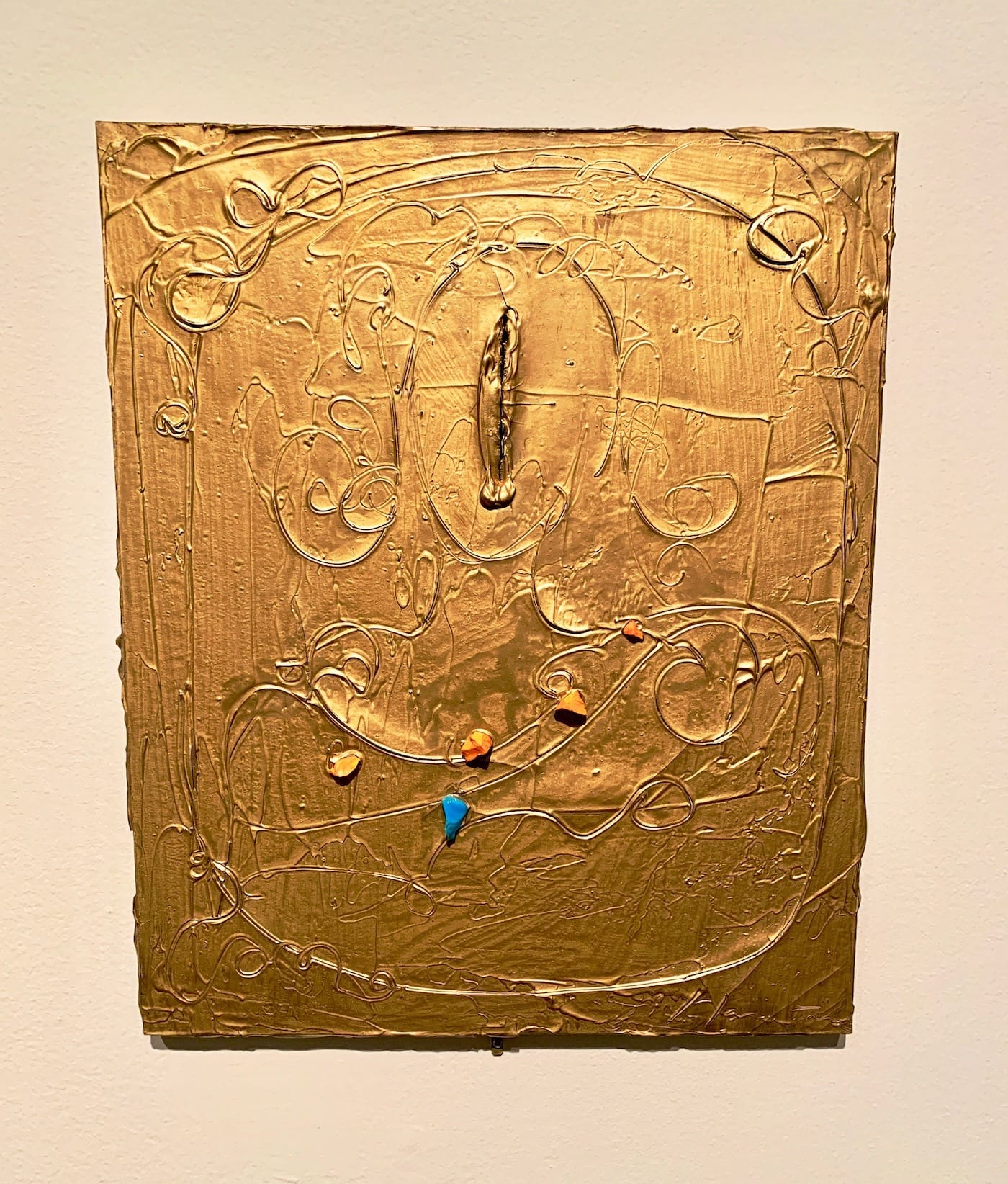 Biographical gripes aside, On the Threshold succeeds as an intimate documentation of Fontana’s aesthetic evolution from sculptor to experimenter extraordinaire. The first work seen in the exhibition is the artist’s bronze “Seated Young Lady” (1934), which strikes a delicate image of repose even if the figure is somewhat drowning in the puddle of her molasses-colored gown. Nearby are five busts of women, each demonstrating how the artist explored sculpted figuration with different materials. Figures include a 1946 painted terracotta woman and a 1952 glazed ceramic portrait of fascist-futurist writer Milena Milani. The best of this quintet is undoubtedly the artist’s glittering 1940 mosaic of his wife, “Portrait of Teresita.” Pulling on inspirations as diverse as the Etruscans, Baroque sculpture, and Futurism, Fontana’s early sculptures celebrate an archaic realism informed by revived interest in ancient art thanks to the nationalist Italianate movement.
